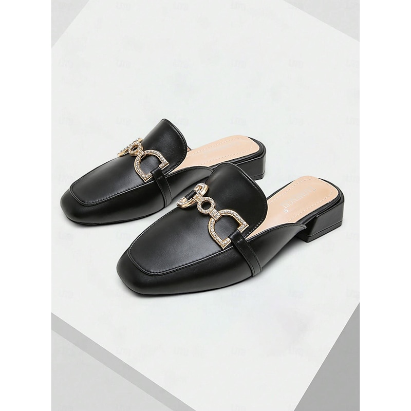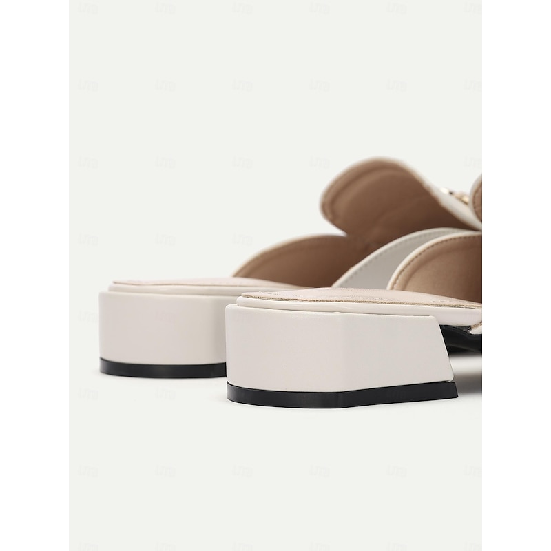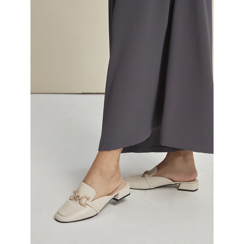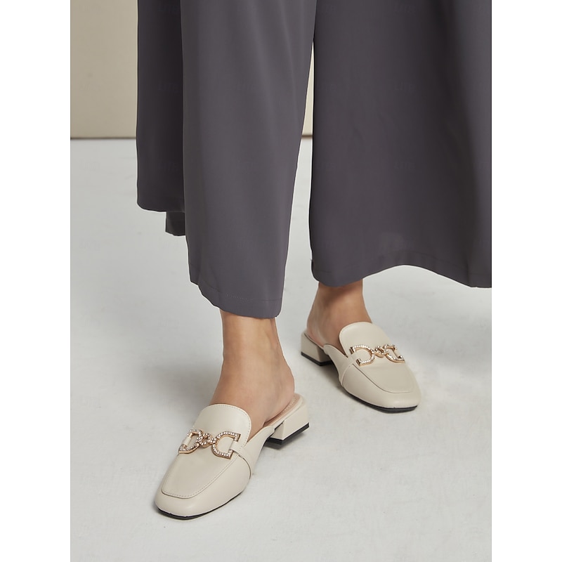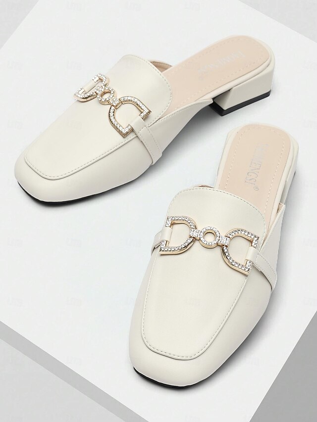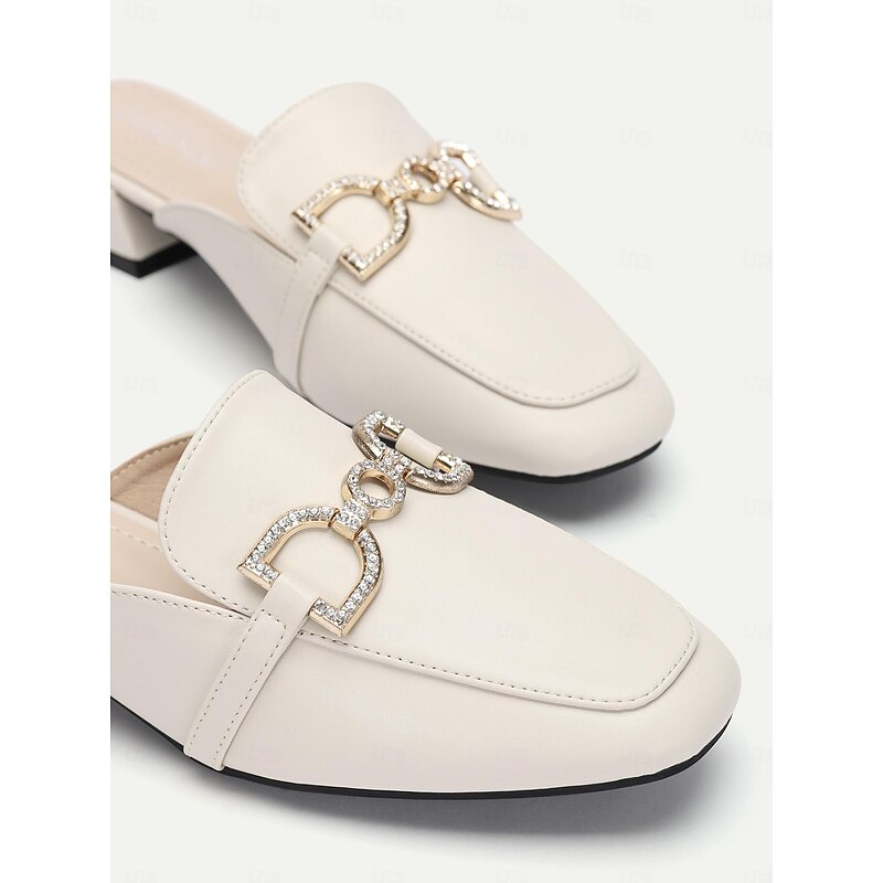 Highlights [Fabric] : Crafted from premium faux leather, these women's mules offer a soft, supple texture for a comfortable feel. The cream shade enhances their versatility, making them suitable for various outfits. [Fit] : Designed with a modern square toe and a comfortable block heel, these mules provide stability and ease for all-day wear. The cushioned insole adds an extra layer of comfort, ensuring your feet feel supported throughout the day. [Design Highlights] : Featuring a glamorous gold-tone chain embellishment adorned with sparkling rhinestones, these mules add a touch of luxury to your ensemble. The sleek slip-on style is both elegant and convenient for quick dressing. [Occasions] : Ideal for both casual and formal settings, these mules are perfect for daily wear, business meetings, or office environments. Their versatile design makes them a chic choice for any occasion, from workdays to weekend outings. [Size Range] : Available in a range of sizes from US5.5 to US10.5 (EU35 to EU42, UK3.5 to UK8.5), providing options for a comfortable fit across different preferences.