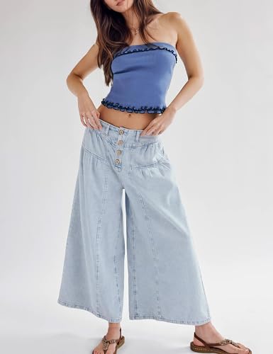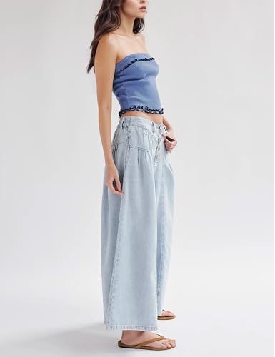 More information about Lentta Women's Wide Leg Jeans Mid Rise Trousers Elastic Waist Button Pleated Denim Pants with Pockets(LightBlue-XL)