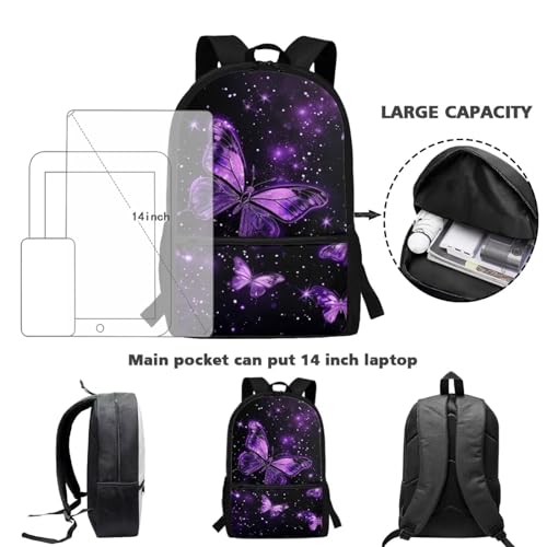 Purple Butterfly Print Backpack for Girls 5th Grade Girl Kids Backpack 15 Inch Fashion Rucksack Waterproof Travel Daypack, Back to School Gifts 4