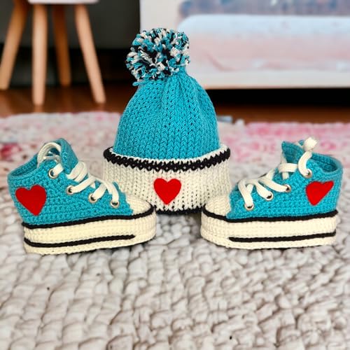 Turquoise Crochet Baby Booties & Beanie Set, Newborn Custom Sneakers, Handmade Infant Shoes, Soft Sole Knit Baby Boots, Newborn Baby Gift 1