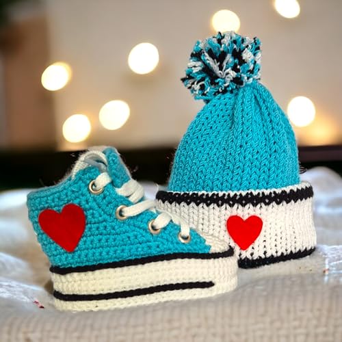 More information about Turquoise Crochet Baby Booties & Beanie Set, Newborn Custom Sneakers, Handmade Infant Shoes, Soft Sole Knit Baby Boots, Newborn Baby Gift