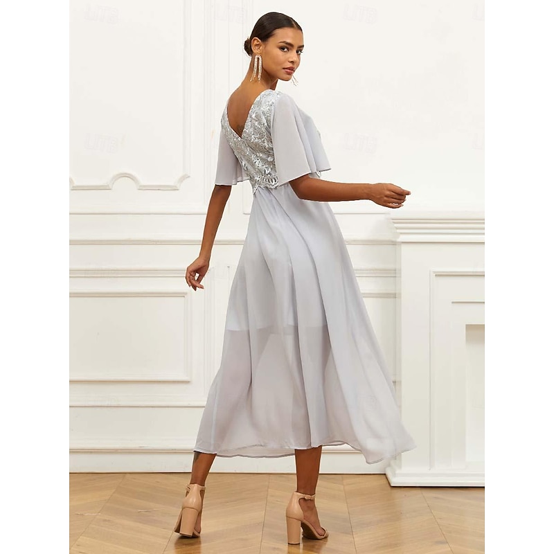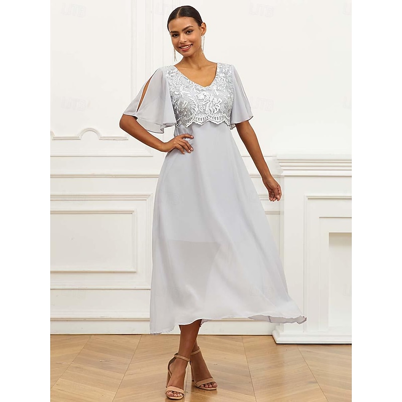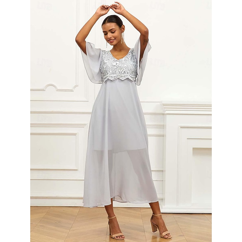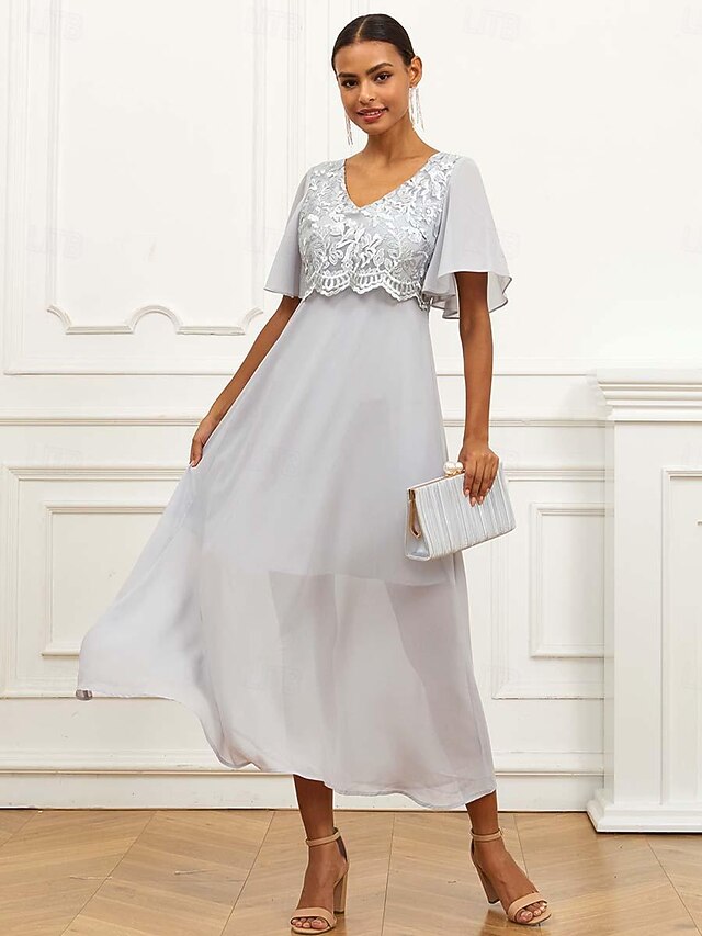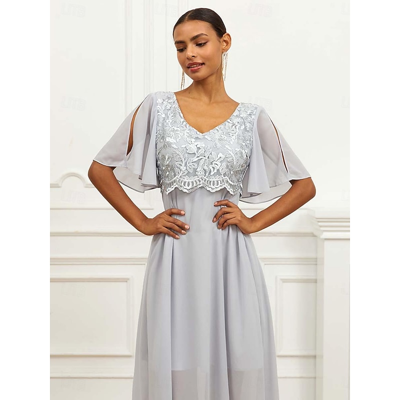 HOT ! Women's Wedding Guest Cocktail Dress Lace Ruffle V Neck Flounce Sleeve Short Sleeve Maxi Dress Party Elegant Formal Gray Summer