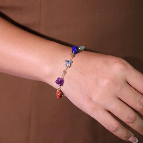 7 Chakra Reiki Gemstones Plated 14k Gold Chain Bracelets for Women Meditation Colorful Crystal Chips Beaded Bracelets (6″-8″) 7