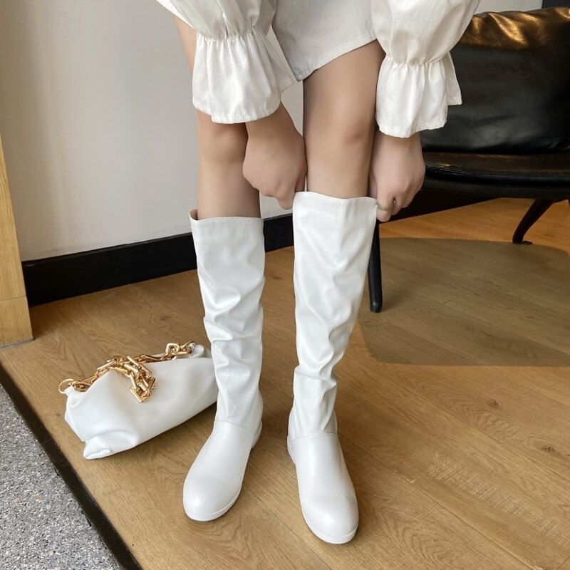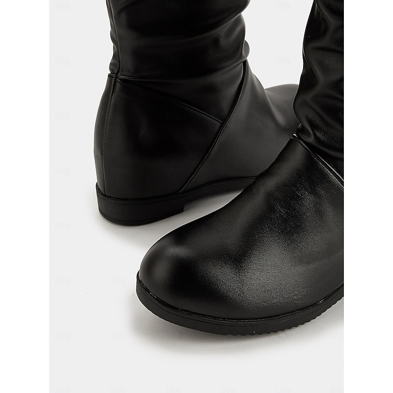 Highlights [Fabric & Material] : Crafted from high-quality PU faux leather, these women's boots offer an elegant yet durable option for everyday wear. The smooth, glossy finish lends a sophisticated look, ensuring they remain stylish through all seasons. [Fit & Silhouette] : Featuring a slouchy mid-calf design, these boots strike the perfect balance between coverage and casual style. The flat soles provide excellent stability and support, making them ideal for walking across various terrains, while the inner lining ensures comfort for prolonged wear. [Design Highlights] : The boots come with a hidden heel that subtly enhances height while maintaining comfort. Additionally, the round toe design and convenient zipper closure add to the functionality and modern appeal of the boots. [Occasions] : Perfect for daily wear, these boots transition easily from day to night, whether paired with jeans, skirts, or dresses. Ideal for casual outings, they suit a variety of occasions and climates, making them a versatile addition to any wardrobe. [Size Advice] : These boots are true to standard sizing, allowing you to select your usual size with confidence. Available in a range of sizes from US5.5 to US10.5, they cater to a broad spectrum of foot sizes.