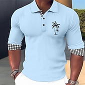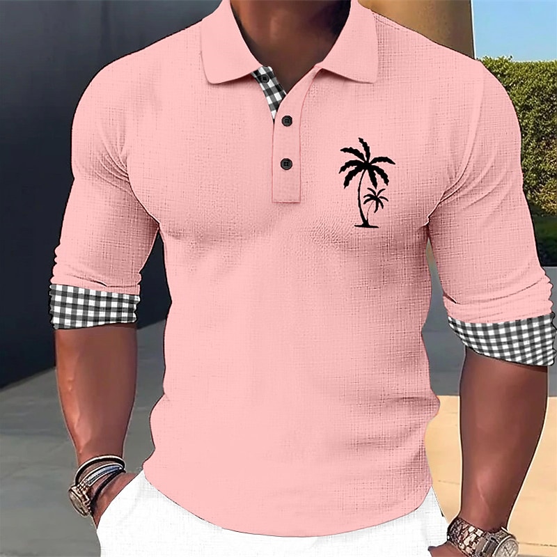 Highlights [Fabric] Crafted from a textured, breathable fabric, this men's long-sleeved polo shirt offers optimal comfort and ease of movement, making it an ideal choice for both warm climates and active days. [Fit] Featuring a sleek, slim fit, the shirt presents a modern and stylish silhouette that complements both casual and smart-casual wardrobes. [Design Highlights] The shirt boasts an embroidered palm tree emblem on the upper left side, infusing a tropical vibe. Its traditional collar comes with a three-button placket for adjustable wear, while the inner lining of the collar and cuffs feature a contrasting black and white checkered pattern, adding a unique visual appeal. [Occasions] Perfect for a variety of settings, including beach outings, vacations, tropical gatherings, and parties, this polo shirt seamlessly blends casual elegance with sophistication. [Size Range] Available in a wide range of sizes from S to 5XL, ensuring a comfortable fit for anyone, regardless of body type. Choose from colors including blue, green, white, pink, and khaki to best suit your personal style.