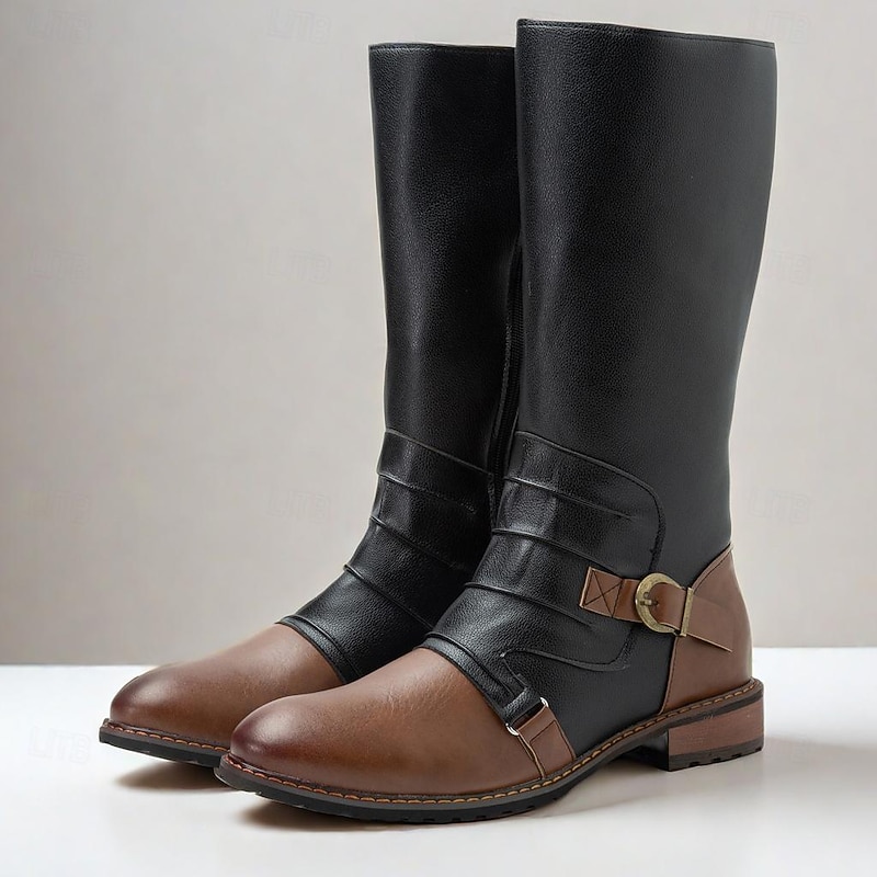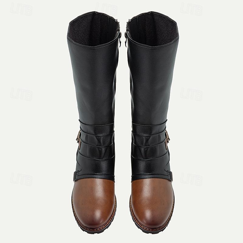 Men's Vintage Black and Brown Leather Riding Boots - Retro Knee-High Boots with Buckle Detail for Casual and Outdoor Wear 1