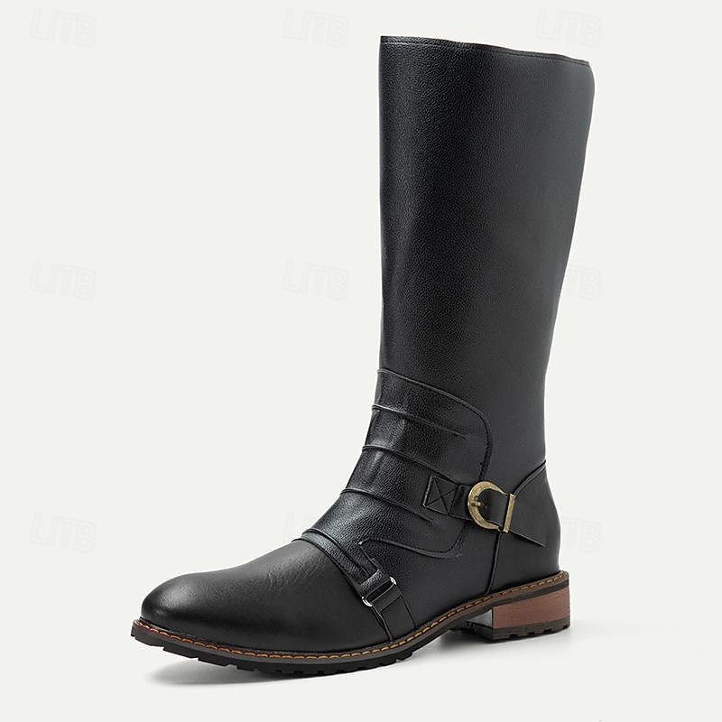 Men's Vintage Black and Brown Leather Riding Boots - Retro Knee-High Boots with Buckle Detail for Casual and Outdoor Wear 4
