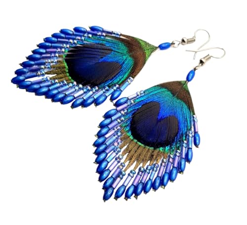 HOT ! Iridescent Peacock Feather Earrings, Hand Beaded Blue Color Beads Peacock Earrings for Women, Handmade Dangle Drop Feather Earrings Fashion Jewelry DA138-A