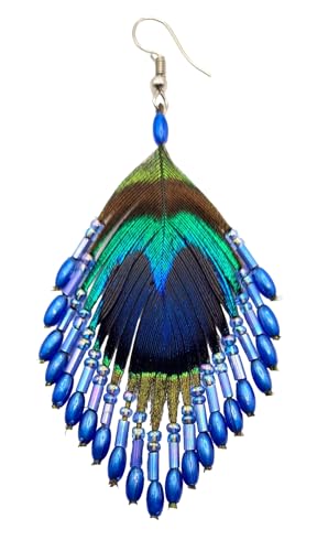More information about Iridescent Peacock Feather Earrings, Hand Beaded Blue Color Beads Peacock Earrings for Women, Handmade Dangle Drop Feather Earrings Fashion Jewelry DA138-A