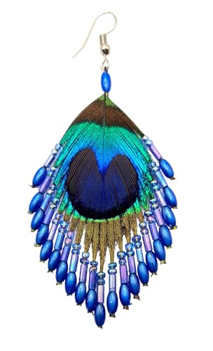 • Rich and intense tones of blues, greens, pinks and gold swirl throughout these beautiful blue color hand beaded diamond shape Peacock Feathers Earrings for women. These lustrous Peacock Earrings are the perfect accent to accompany your Feather Earrings jewelry collection.