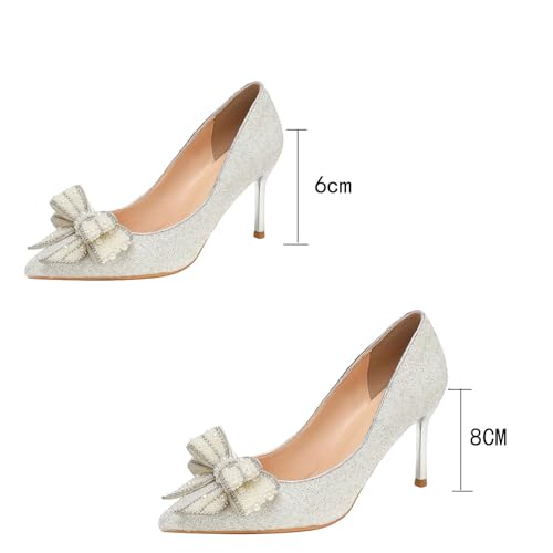 Women's Bow Rhinestone High Heels, Satin Sequins Sparkly Stiletto Sandals Pointed Toe Pull on Pumps Dress Wedding Shoes 6