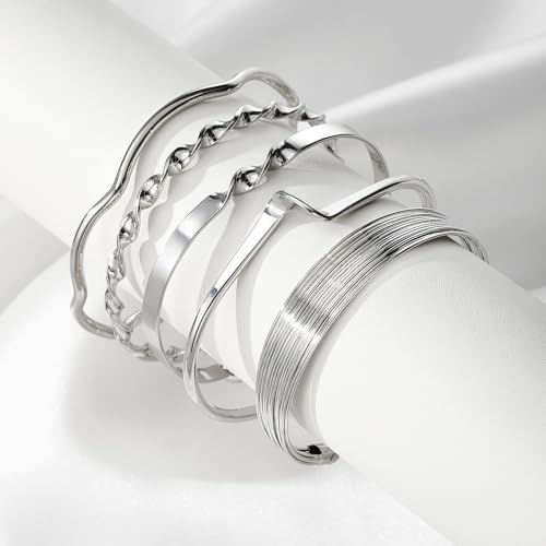 IFKM Silver Bangles Bracelets For Women, Multi Layer Stackable Open Cuff Bracelet Set, Trendy Elegance Charms Non Tarnish Minimalist Textured Boho Jewelry Gift for Women 4