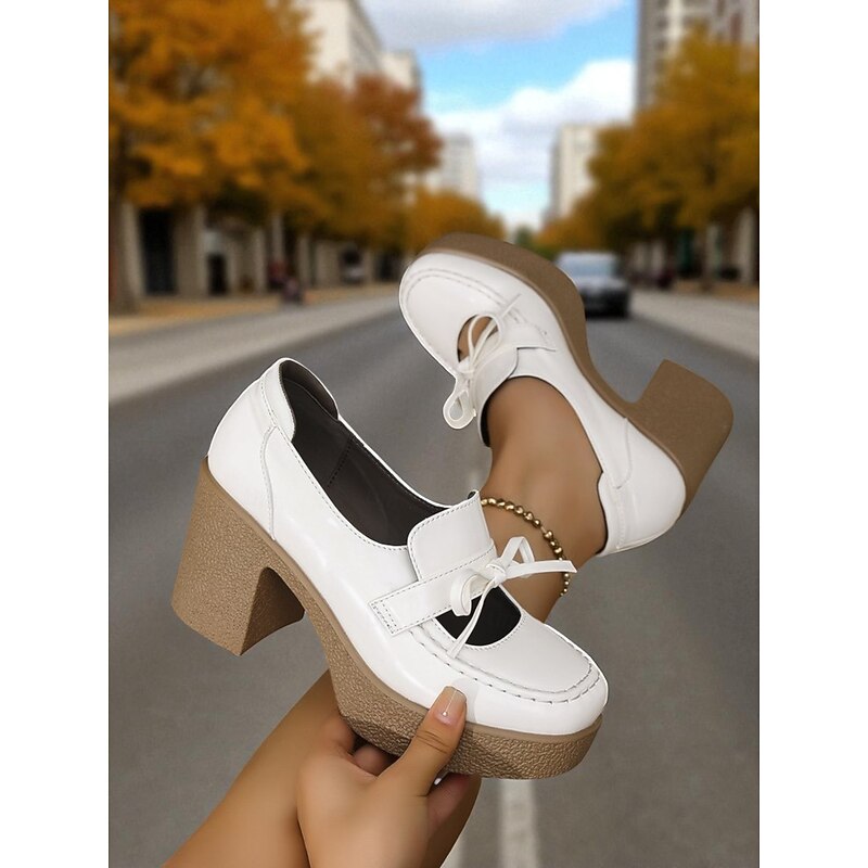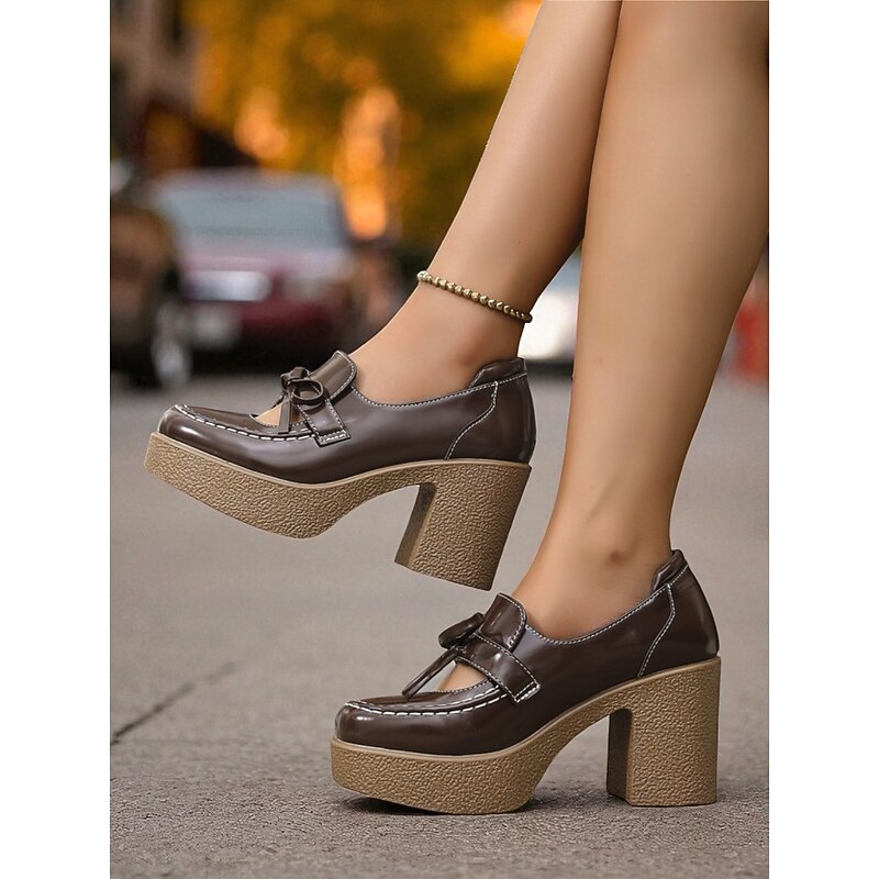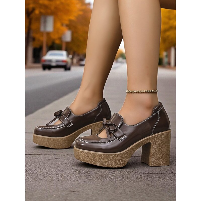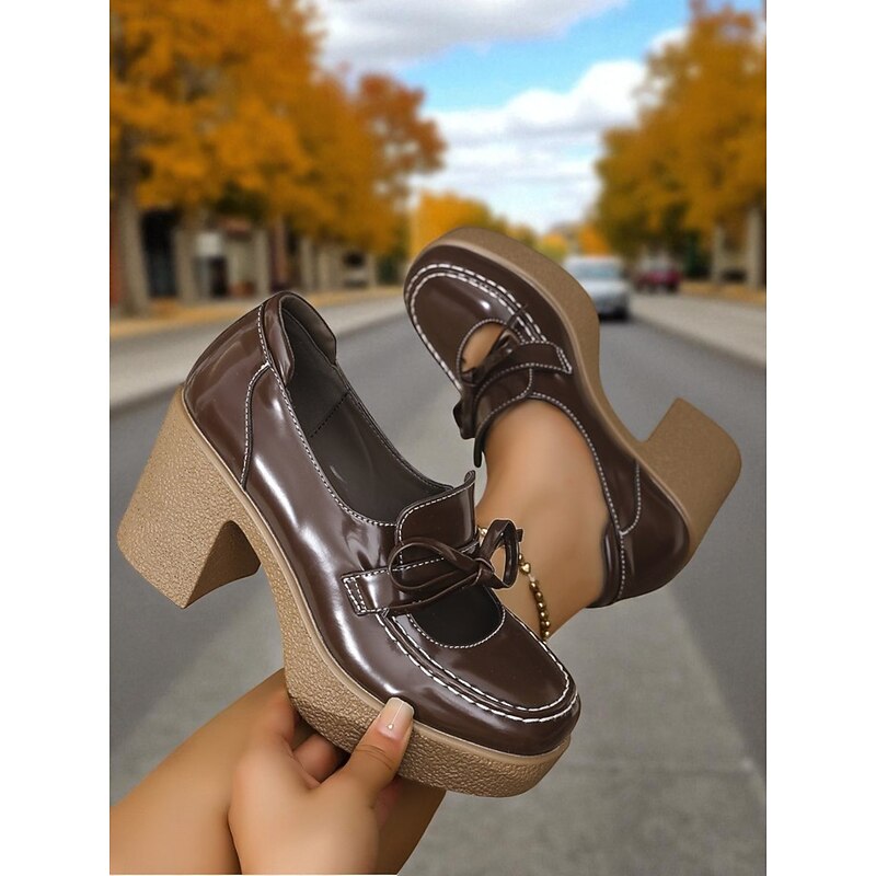 HOT ! Women's Brown Patent Faux Leather Platform Loafers - Retro 1980s Chunky Heel Bow Slip-On Shoes for School, Fall Outfits & Daily Wear