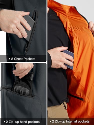 • 【Waterproof & Breathable Vest】Durable water repellent treatment on the outer material, mid-layer fabric is laminated with breathable TPU membrane, this men’s vest outerwear will keep your core dry and comfortable in the light rain.(5000MM fabric waterproofness rating, 3000G/M2/24hr fabric breathability rating)