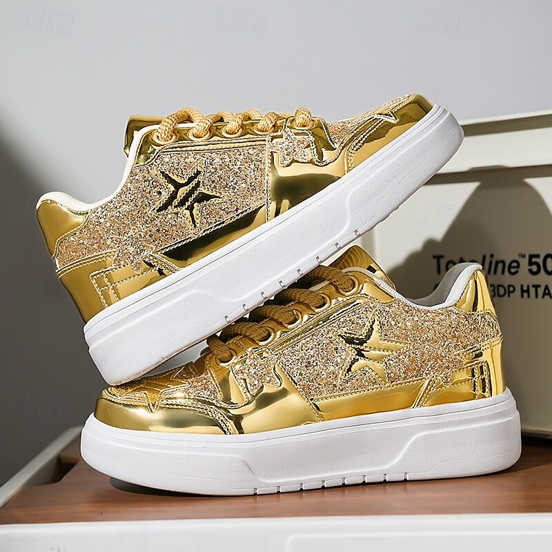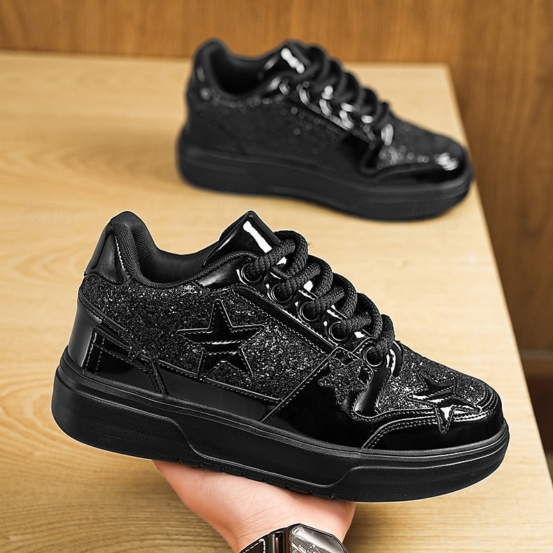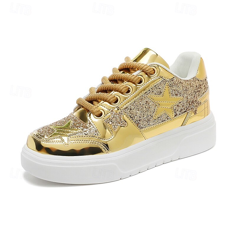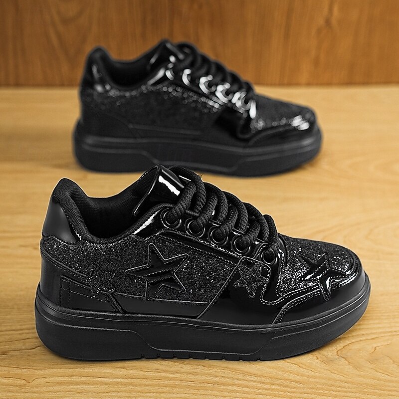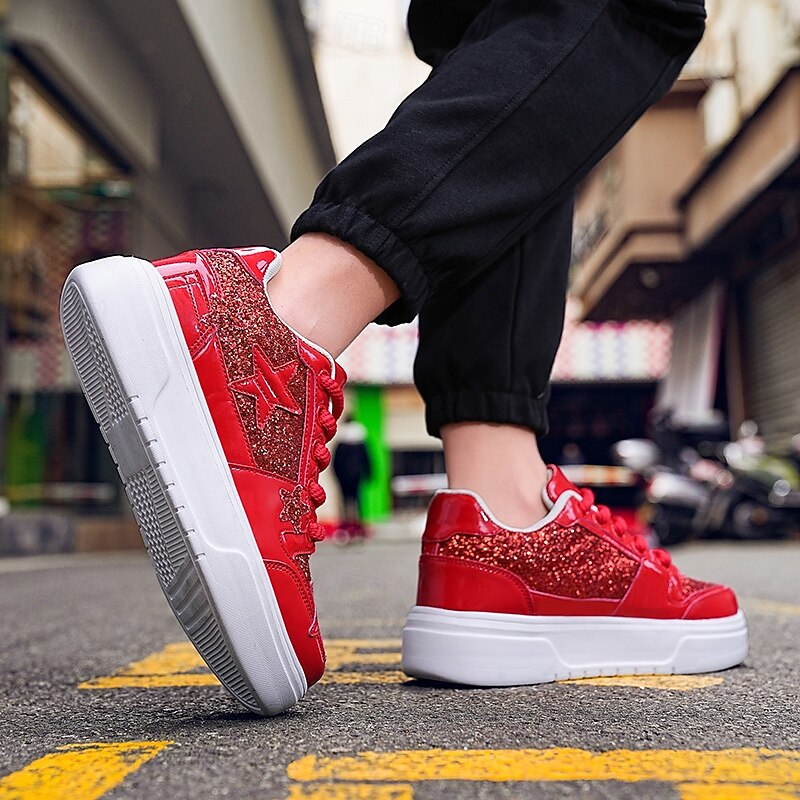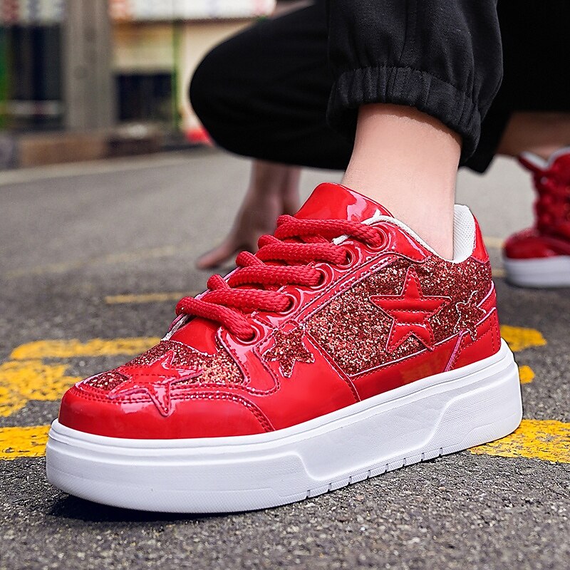 Highlights Fabric : These Women's Red Glitter Star Sneakers are crafted with a vibrant knit upper that combines flexibility and breathability, ensuring a comfortable fit for all-day wear. The glossy finish of the patent faux leather upper enhances its stylish look while offering durability. Fit : Featuring a classic round toe design, these sneakers provide ample room for movement, maintaining a snug fit due to the lace-up closure. The cushioned interior lining further promotes comfort, making these sneakers ideal for extended use. Design Highlights : Stand out with star-shaped embellishments and embedded glitter details that give these sneakers a playful and eye-catching aesthetic. The clean white rubber sole not only adds contrast but also promises slip resistance and durability. Occasions : Whether you're heading to a party or enjoying a casual day out, these sneakers are perfect for various settings. Their stylish design makes them easy to pair with trendy outfits, ensuring you look fashionable on any occasion. Size Range : Available in sizes ranging from US6-6.5 to US10.5, catering to a diverse set of footwear needs.