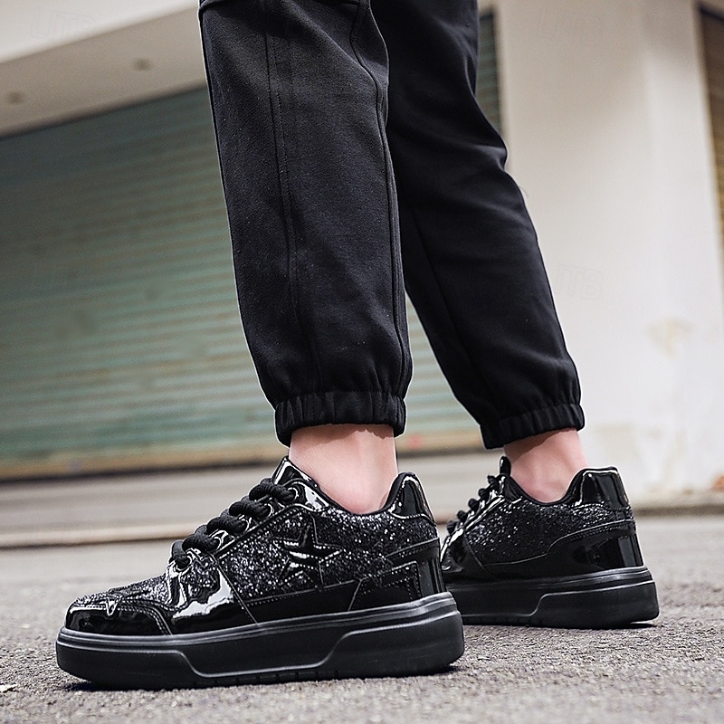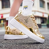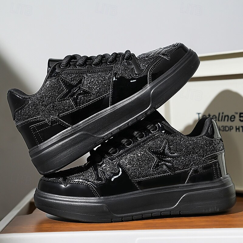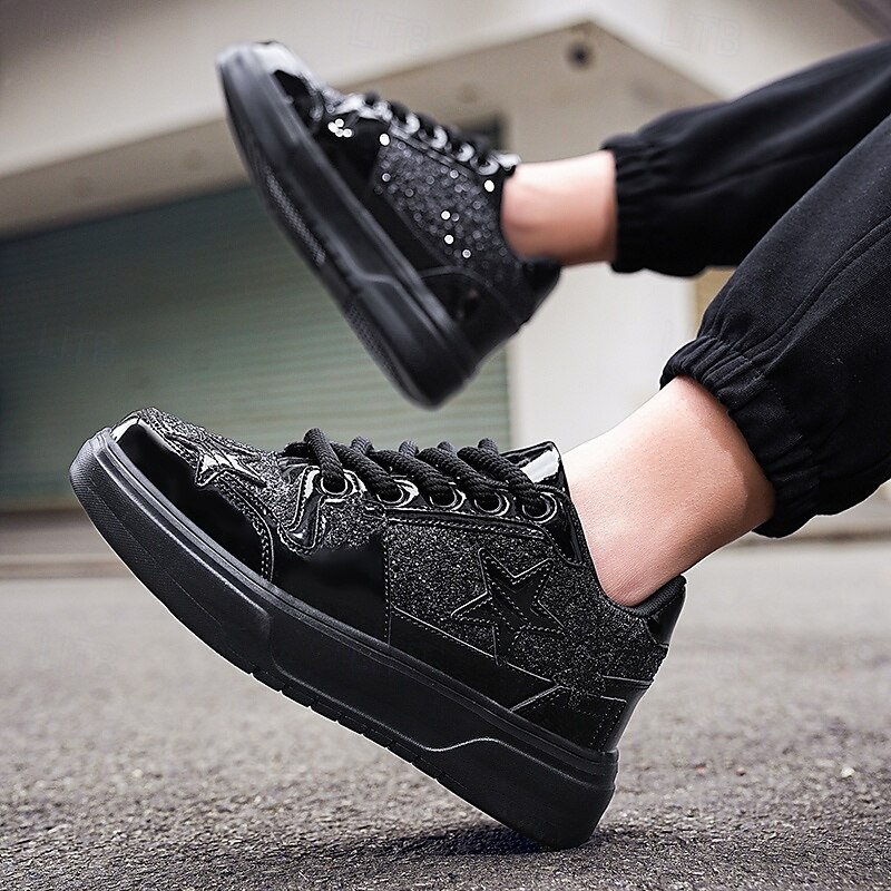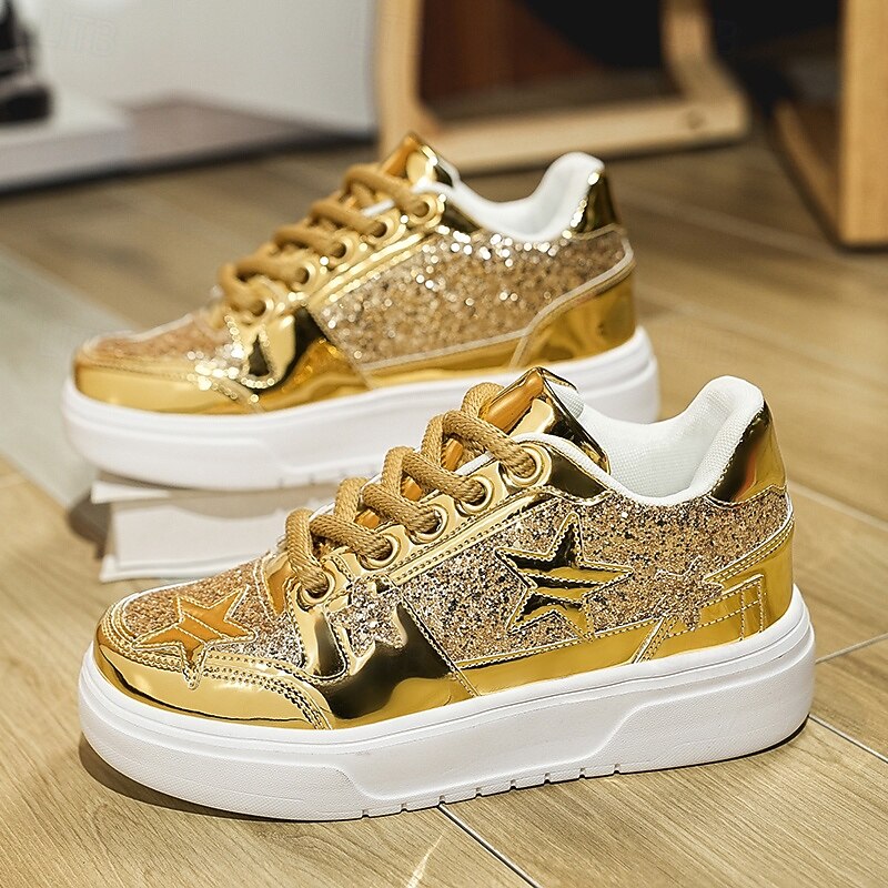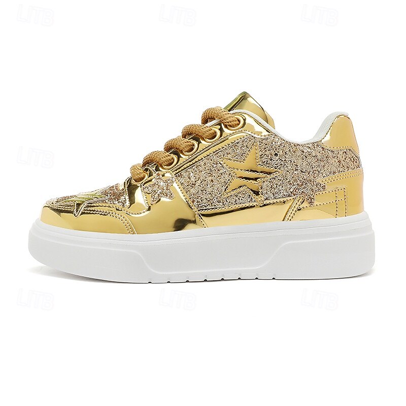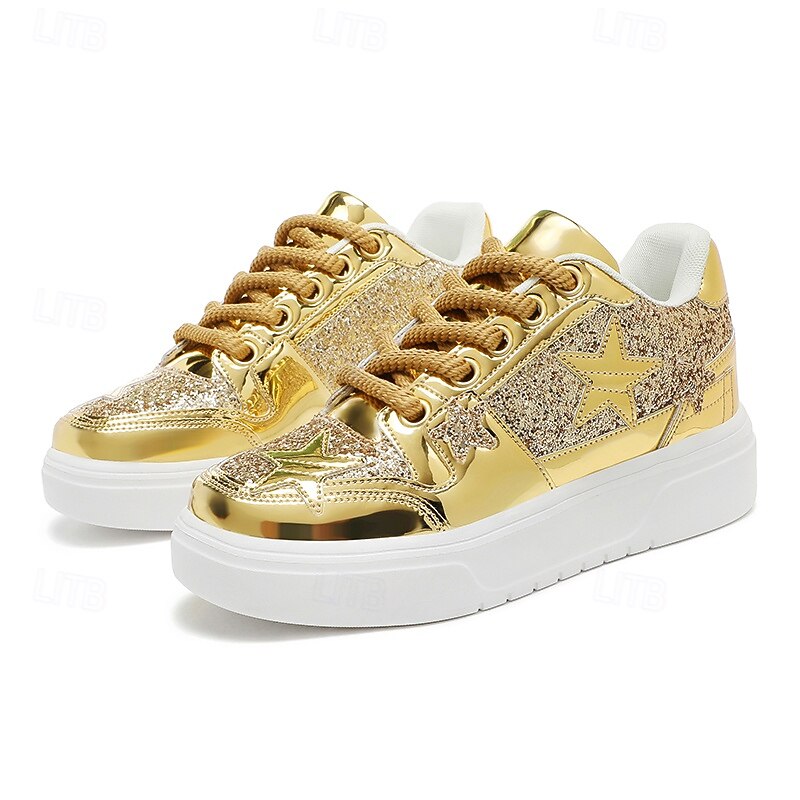 Highlights Fabric : These Women's Red Glitter Star Sneakers are crafted with a vibrant knit upper that combines flexibility and breathability, ensuring a comfortable fit for all-day wear. The glossy finish of the patent faux leather upper enhances its stylish look while offering durability. Fit : Featuring a classic round toe design, these sneakers provide ample room for movement, maintaining a snug fit due to the lace-up closure. The cushioned interior lining further promotes comfort, making these sneakers ideal for extended use. Design Highlights : Stand out with star-shaped embellishments and embedded glitter details that give these sneakers a playful and eye-catching aesthetic. The clean white rubber sole not only adds contrast but also promises slip resistance and durability. Occasions : Whether you're heading to a party or enjoying a casual day out, these sneakers are perfect for various settings. Their stylish design makes them easy to pair with trendy outfits, ensuring you look fashionable on any occasion. Size Range : Available in sizes ranging from US6-6.5 to US10.5, catering to a diverse set of footwear needs.
