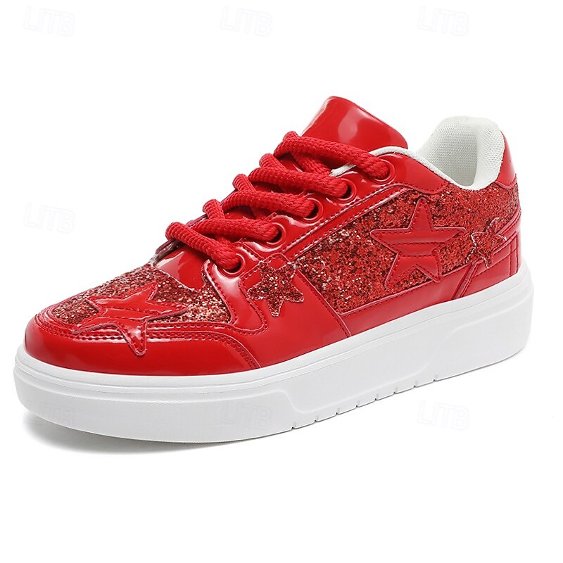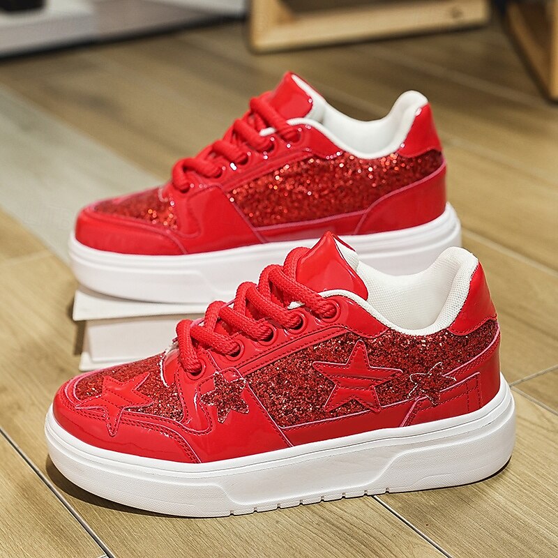 Women's Red Glitter Star Sneakers - Stylish Patent Faux Leather Design with Comfortable White Sole for Casual and Party Wear 36