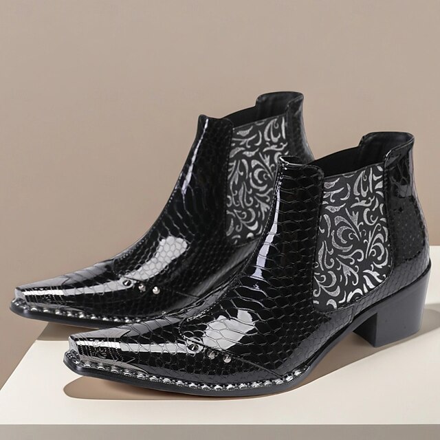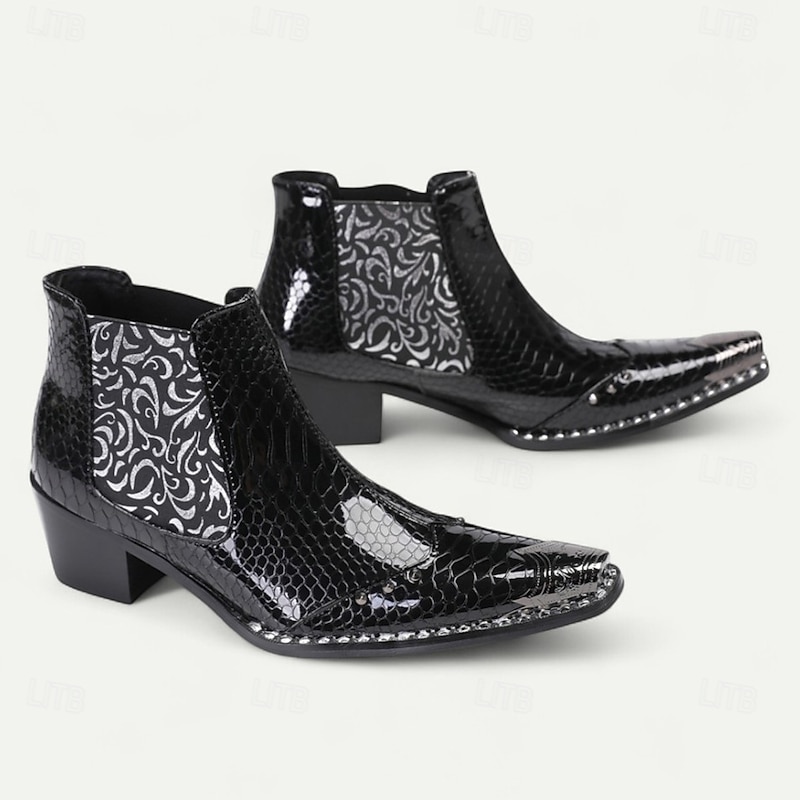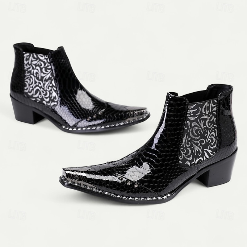 HOT ! Men's Black Patent Crocodile Pattern Boots – Embossed Floral Pointed Toe Dress Shoes for Stage Shows, Parties and Night Out
