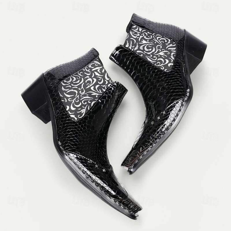 Men's Black Patent Crocodile Pattern Boots – Embossed Floral Pointed Toe Dress Shoes for Stage Shows, Parties and Night Out 1
