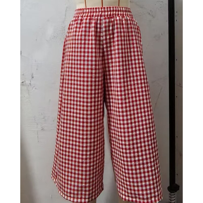 Women's Wide Leg Slacks Streetwear Casual Full Length Natural Plaid Pocket Elastic Waist Comfy Outdoor Vacation Going out Black & White Black Red Dark navy Fall Regular Fit 9