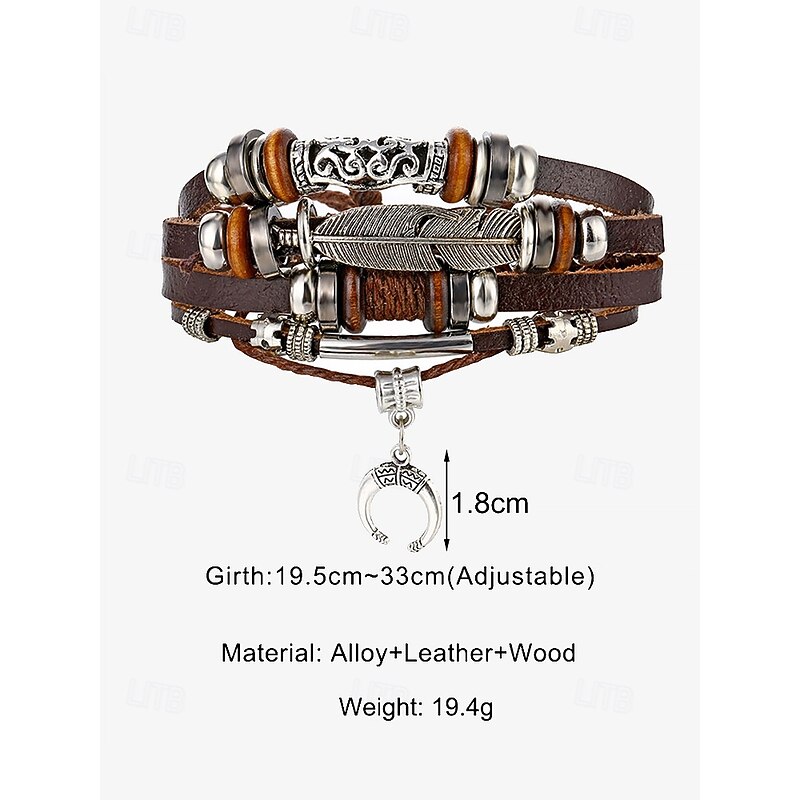 More information about Men's Boho Multi-Layer Leather Bracelet with Feather and Crescent Moon Charm – Vintage-Inspired Adjustable Wrap Bracelet for Casual Style