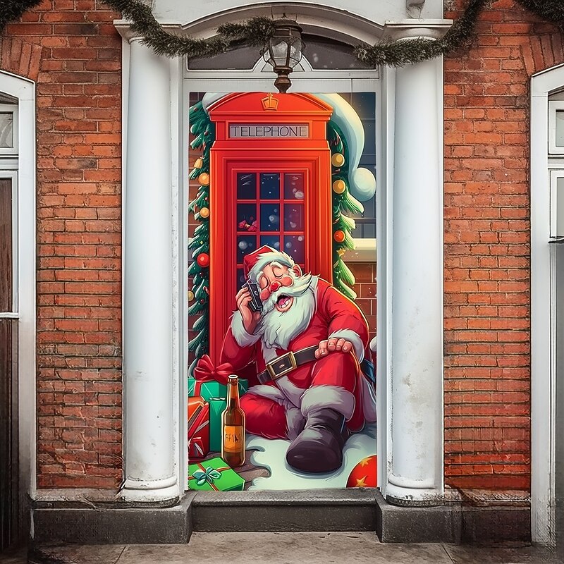 HOT ! Christmas Door Cover Holiday Curtain Decoration Winter Theme Drapes Featuring Santa Claus And Phone Booth Print Large Fabric Panel Festive Home Decor For Living Room Bedroom Entryway Celebration
