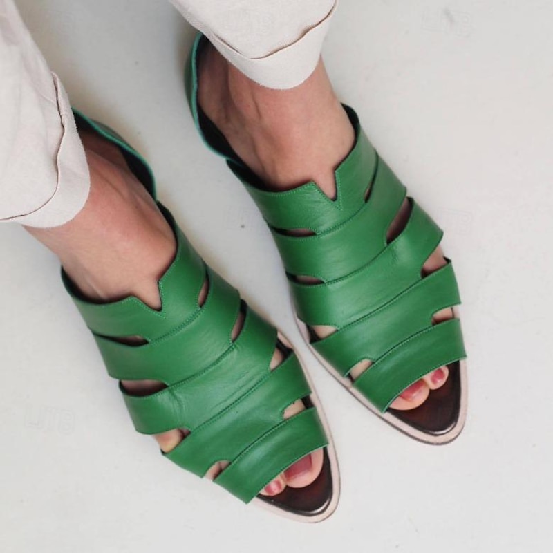 Highlights [Fabric] : Constructed with high-quality PU leather, these women's flats provide a comfortable and durable wear, perfect for the warm summer season. The breathable material ensures that your feet remain cool and comfortable throughout the day. [Design] : These sandals feature a stylish hollow-out pattern with a chic peep toe design, combining vintage charm with modern flair. The versatile flat heel design offers stability and comfort for prolonged wear, making them an ideal choice for day-long activities. [Design Highlights] : The innovative open-toe design with multiple elegant straps crossing over the foot creates a fashionable yet timeless look. The intricate cut-out pattern not only adds a trendy touch but also allows for enhanced breathability, keeping your feet cool on warm days. [Occasions] : Ideal for vacations and office environments, these sandals seamlessly transition from casual outings to more polished settings. Their neutral tones, available in Green, Silver, and Apricot, make them easy to pair with a wide range of outfits, from relaxed beachwear to sophisticated office attire. [Size Range] : Available in a wide range of sizes, from US5.5 / EU35 / UK3.5 to US10.5 / EU42 / UK8.5, ensuring a suitable fit for various preferences. Please refer to the size chart provided by the supplier for detailed size guidance.