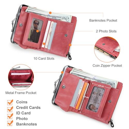 HOT ! CONTACTS Full Grain Leather Kiss Lock Wallet for Women Kiss Clasp Coin Purse Vintage Small Bifold Wallet with Rfid Blocking (Rose Pink)
