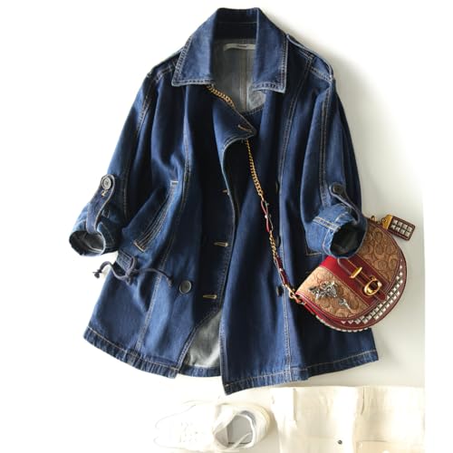 • Loose fit denim blazer jacket for women, adjustable waist, front double breasted button down closure, long sleeve that can roll up, notch lapel, 2 pockets for your hands, hip length, solid color: blue.