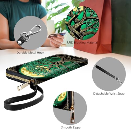 Womens Wallet, PU Leather RFID Cute Wristlet Wallets for Girls Women Ladies Purse Large Credit Card Clutch Purse Card Holder Coin Pocket Travel Wallets with Zipper, Tree Moon 5