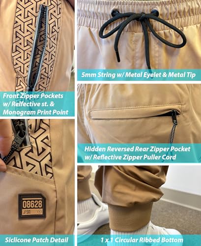 • DESIGN: The drawstring waistband lets you find a customizable fit while the elastic ribbed ankle cuffs bring snug comfort to your day. These basic joggers designed with 2 front straight pocket with a vislon zipper and reflective puller cord. Monogram print detail around front pockets shows differentiation from other products. There are reflective strings on zipper, puller cord, and even drawstring.
