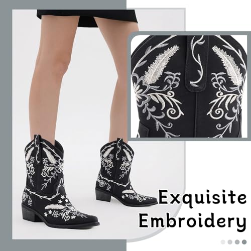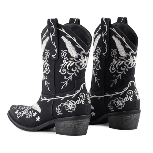 More information about LingxiaUne Women's Western Cowboy Boots - Intricate White Embroidery Mid - Heel Boots