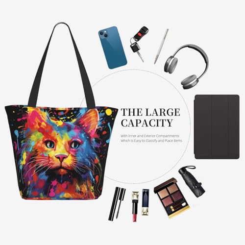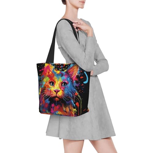 • STRONG AND DURABLE - Our cloth grocery tote bag is made of polyester, lock stitching inside for maximum strength allowing the Colorful paint painting of cat tote bag to hold up extra bearing capacity, sturdy enough for all kinds of daily use