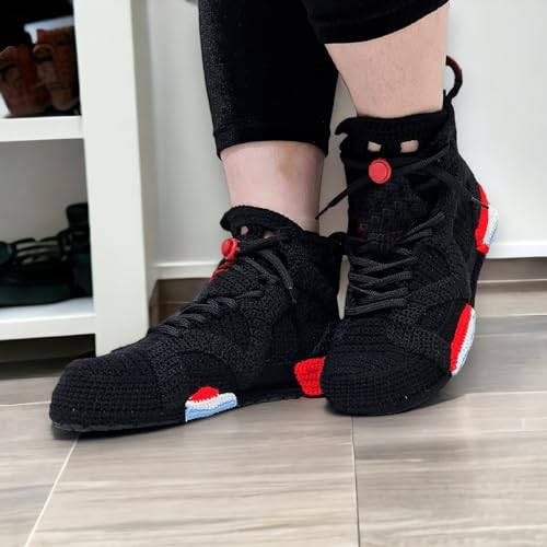 Custom Air Sneakers 6 Black Infrared Crochet Sneakers Slippers - Handmade Basketball Sneaker Style Knitted Booties, Personalized Funny Lightweight Cozy Shoes, Streetwear Hip Hop Style Comfort Shoes 9