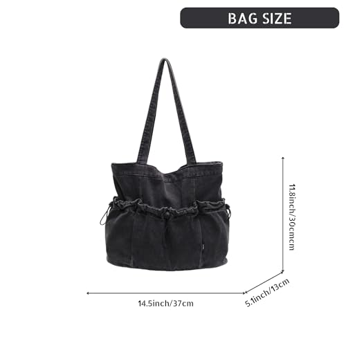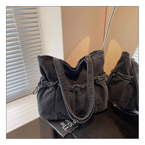 HOT ! Women's Denim Shoulder Bag with Drawstring, Multi-Pockets Lightweight Hobo Purse for Daily Use Travel Shopping