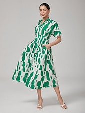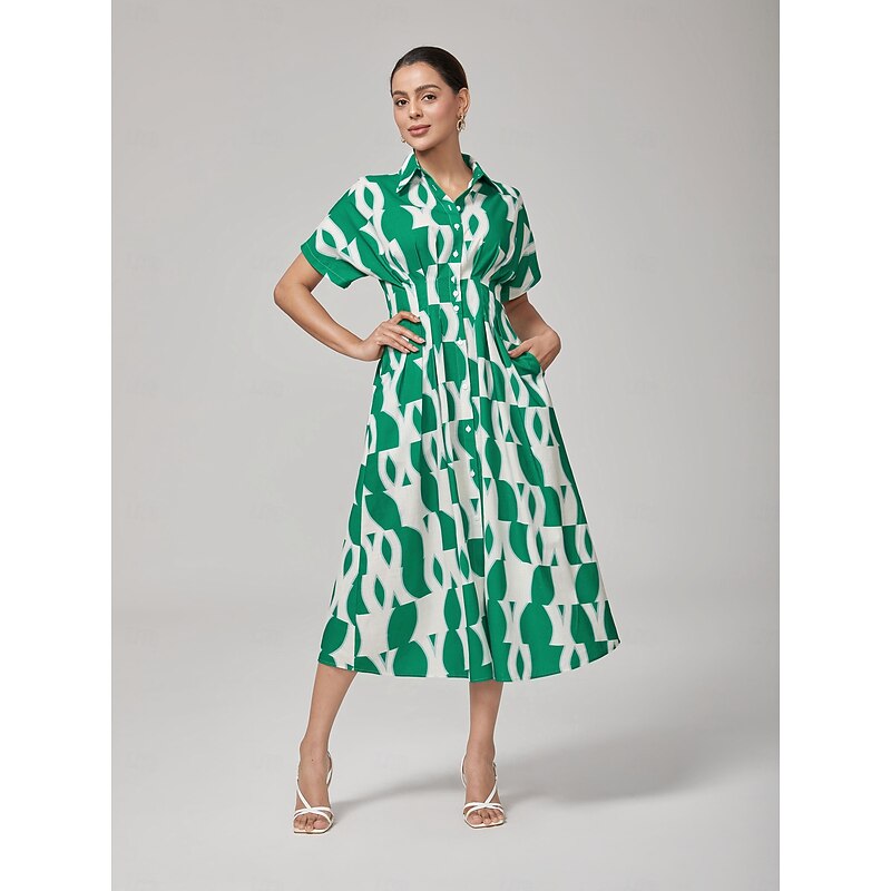 HOT ! Vintage Green Geometric Pleated Shirt Dress