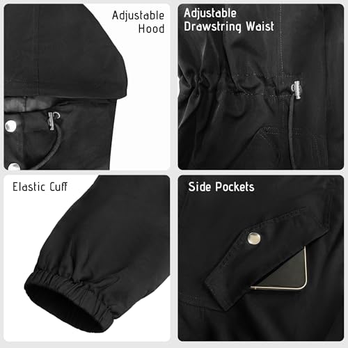 • DESIGN: Adjustable hood and waist drawstring, smooth lining, double closure with zipper and button, elastic cuffs, two side pockets, a lightweight rain coats for women that combines comfort and fashion.