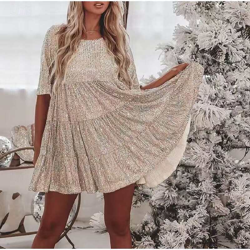HOT ! Women's Mini Dress Sequin Dress Cocktail Dress Elegant Dress Fashion Modern Evening Party Cocktail Party Regular Fit Plain Short Sleeve Crew Neck Silver Black gray Black White Summer Spring