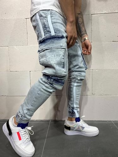Jeans Pants Trouser Denim Stretch Street Trendy Ripped Hole Washed Zipper with Multiple Pockets Leg Binding for Men 6