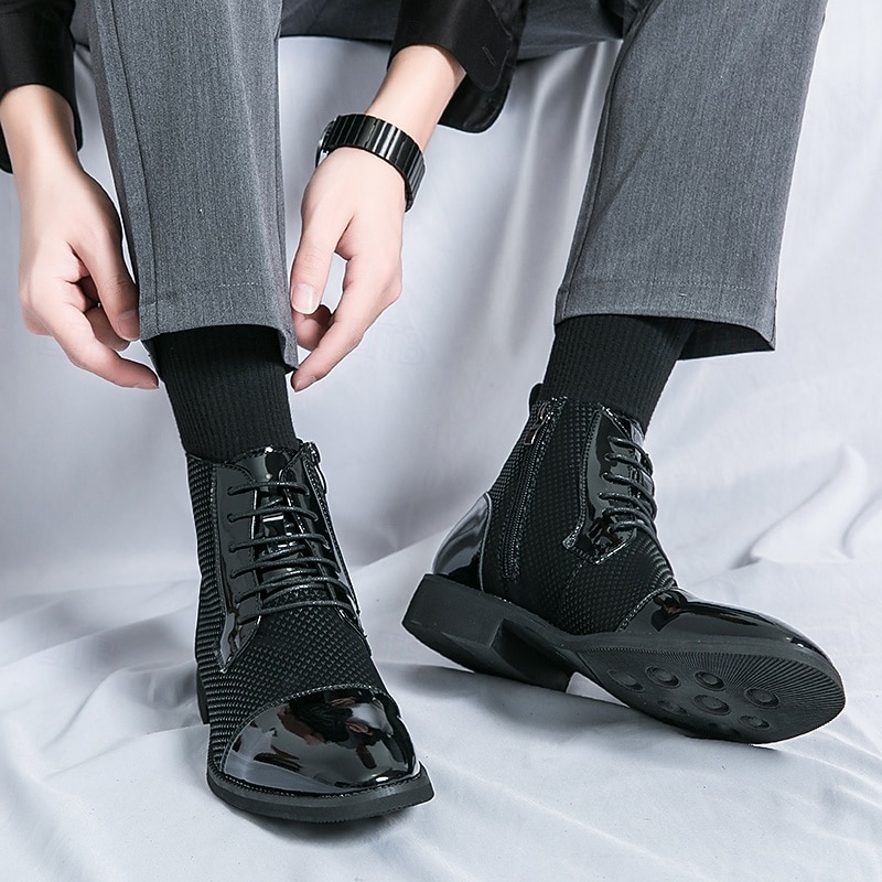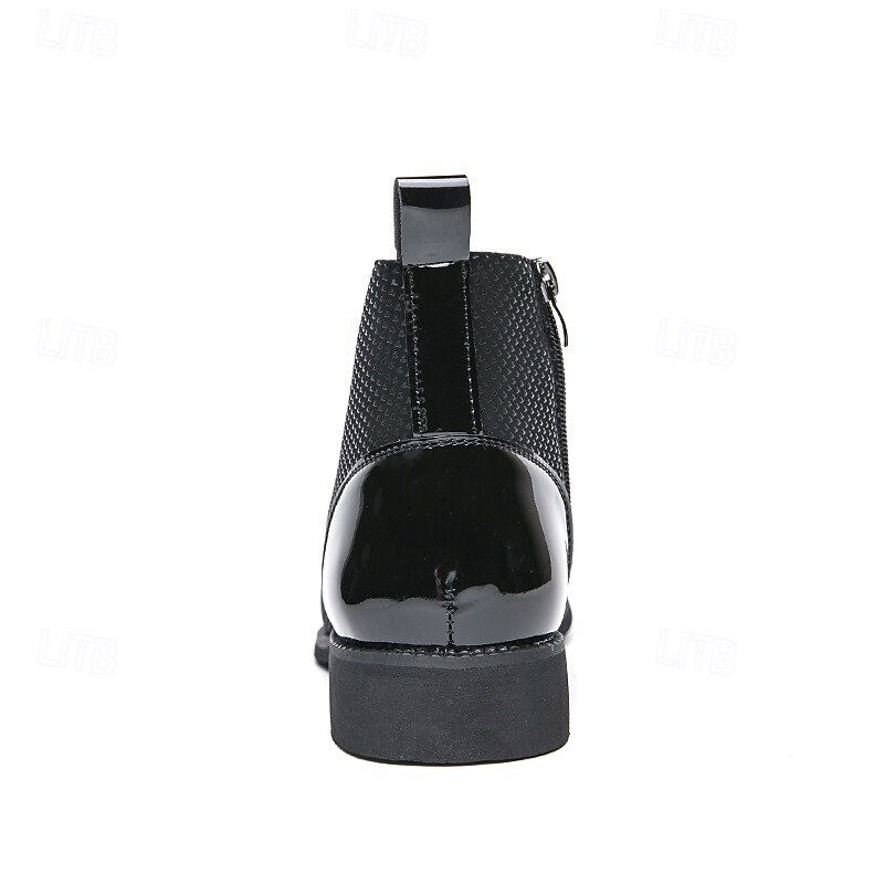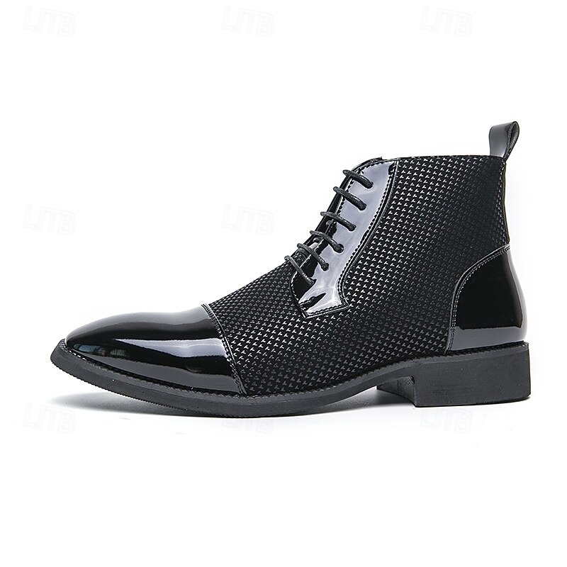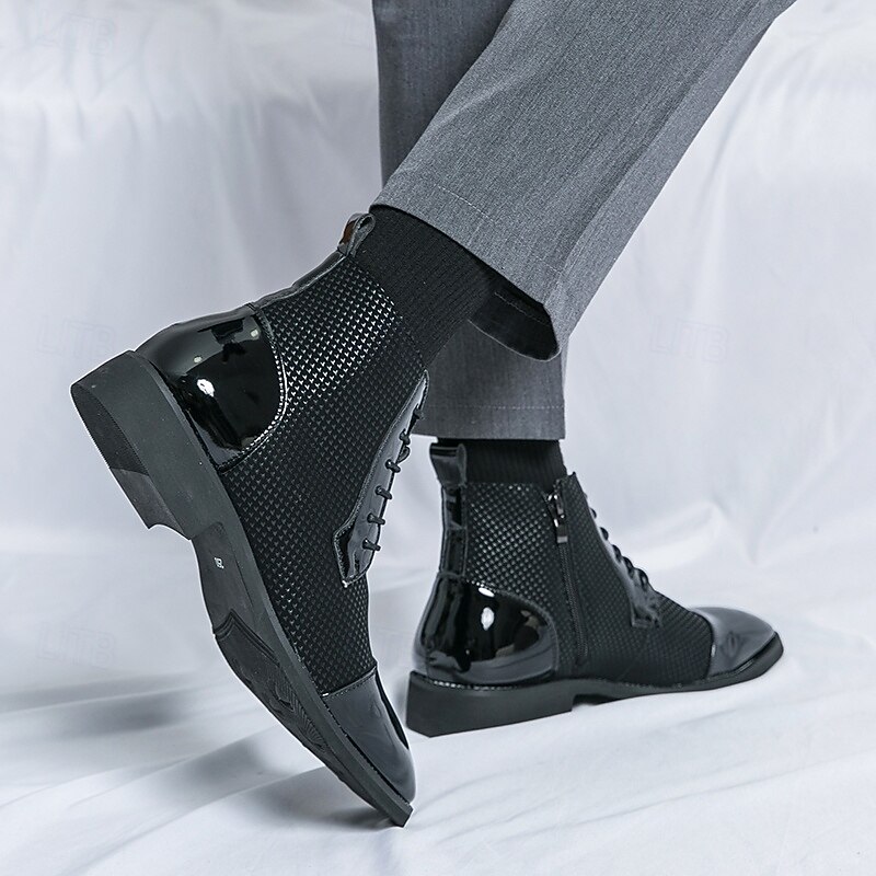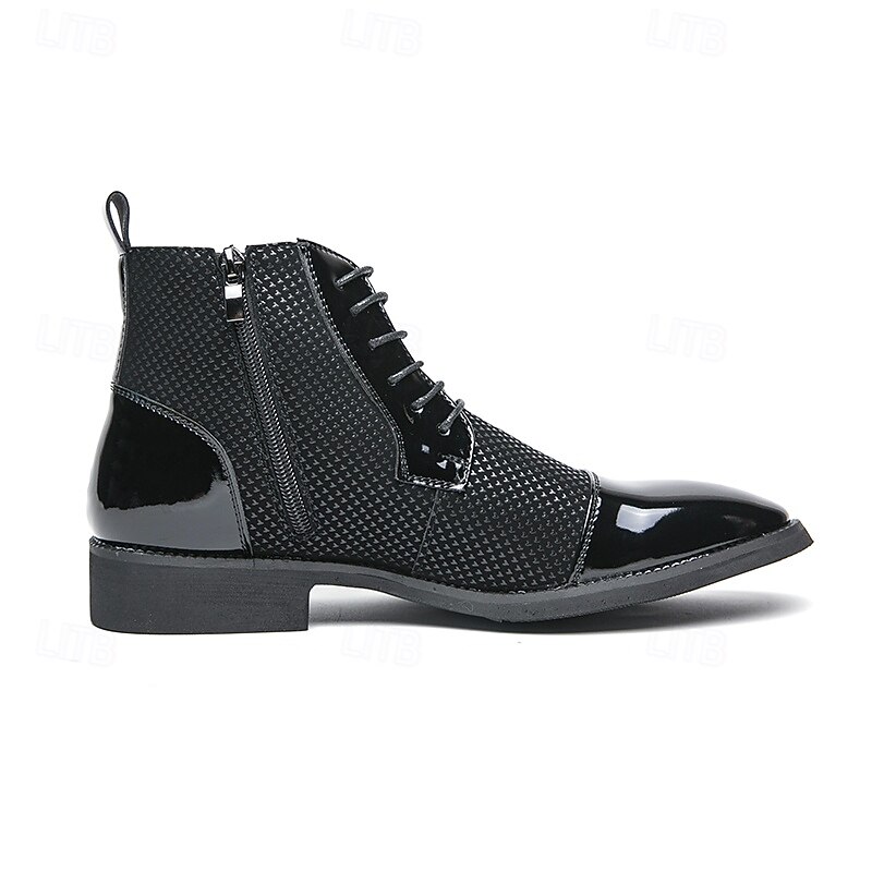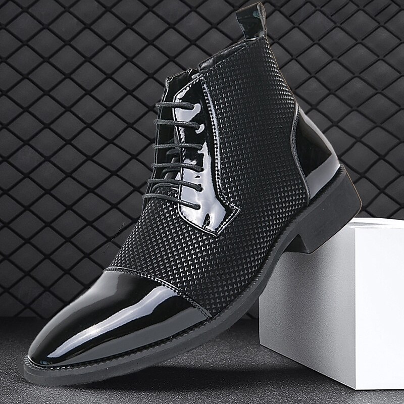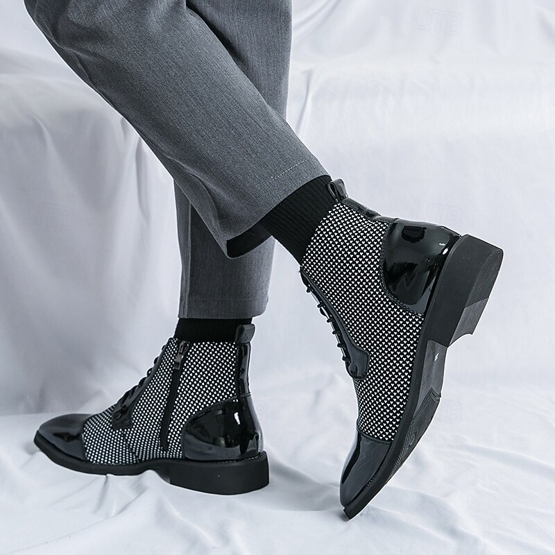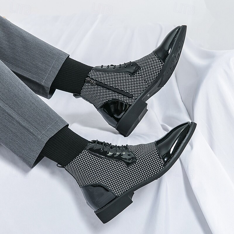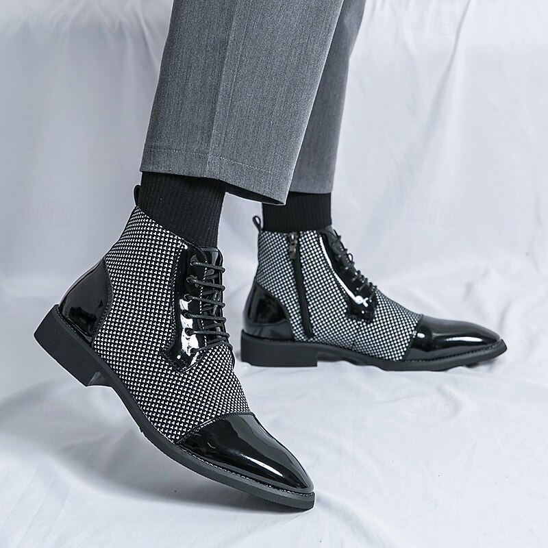 Highlights [Fabric & Material] These men's ankle boots are expertly crafted with a sleek PU leather upper, paired with a durable rubber outsole. The glossy patent-like finish of the PU leather enhances the style's elegance, offering a modern touch with its refined texture. [Silhouette & Fit] Featuring a streamlined design, these boots are constructed with a classic lace-up closure, allowing for an adjustable and secure fit. The round toe shape and loafer closure type combine to provide both comfort and a stylish profile. [Design Highlights] The boots integrate a sophisticated blend of sleek patent leather and textured fabric with a subtle houndstooth pattern, adding a layer of visual interest. The patent finish on the toe cap and heel further enhances their polished appearance, making them standout footwear for any occasion. [Occasions] Perfect for a wide range of formal and semi-formal occasions, these versatile ankle boots are ideal for parties, events, and other special gatherings. Whether attending a business meeting or a festive evening event, they effortlessly add charm and sophistication to any outfit. [Size Range] Available in a variety of sizes to suit different preferences, including US sizes 6 through 11. These options ensure a comfortable fit for different foot sizes, enhancing the overall wearing experience.