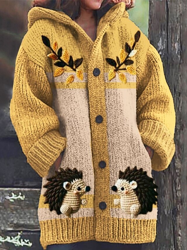 HOT ! Women's Cardigan Vacation Daily Animal Ribbed Hooded Knitted Print Front Pocket Long Sleeve Regular Tops Knit Outdoor Daily Holiday Black Yellow Fall Winter
