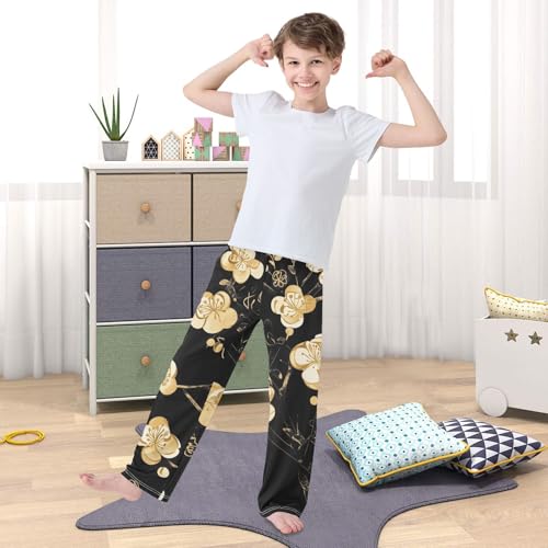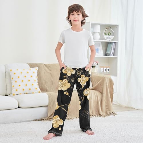 Golden Plum Flowers Boys Long Pants Soft Trousers Elastic Waist Kids Lounge Bottoms with Pockets S-XL 6