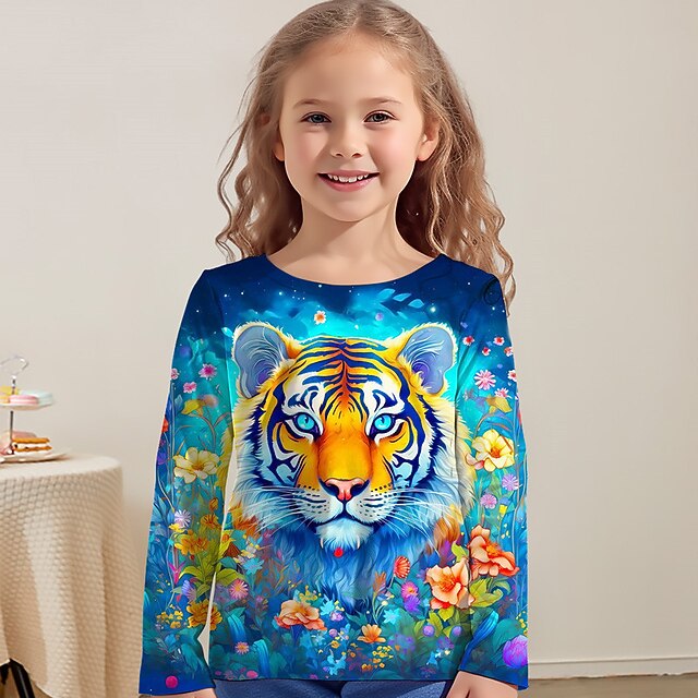 Girls' 3D Graphic Animal Tiger T shirt Tee Long Sleeve 3D Print Fall Winter Active Fashion Cute Kids 3-12 Years Outdoor Casual Daily Regular Fit 7
