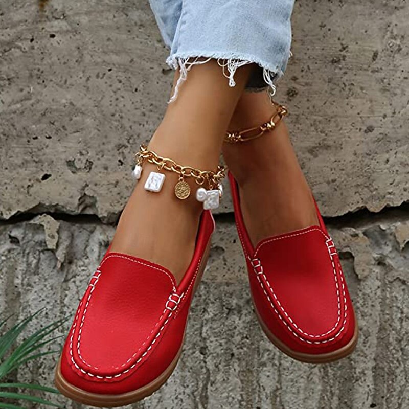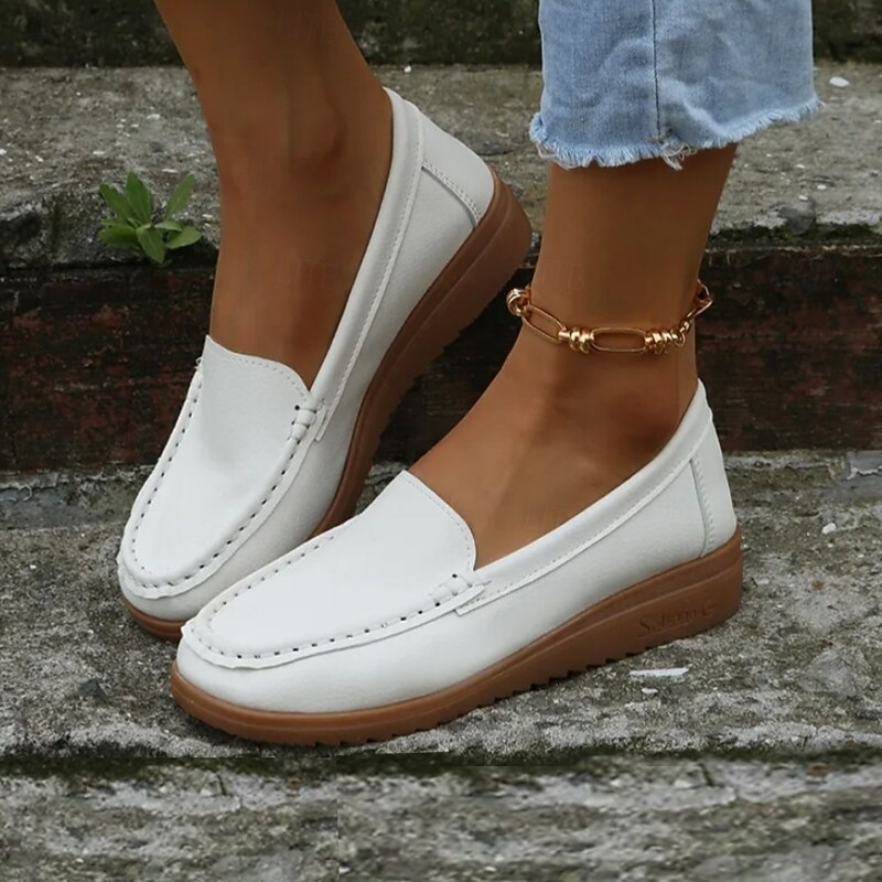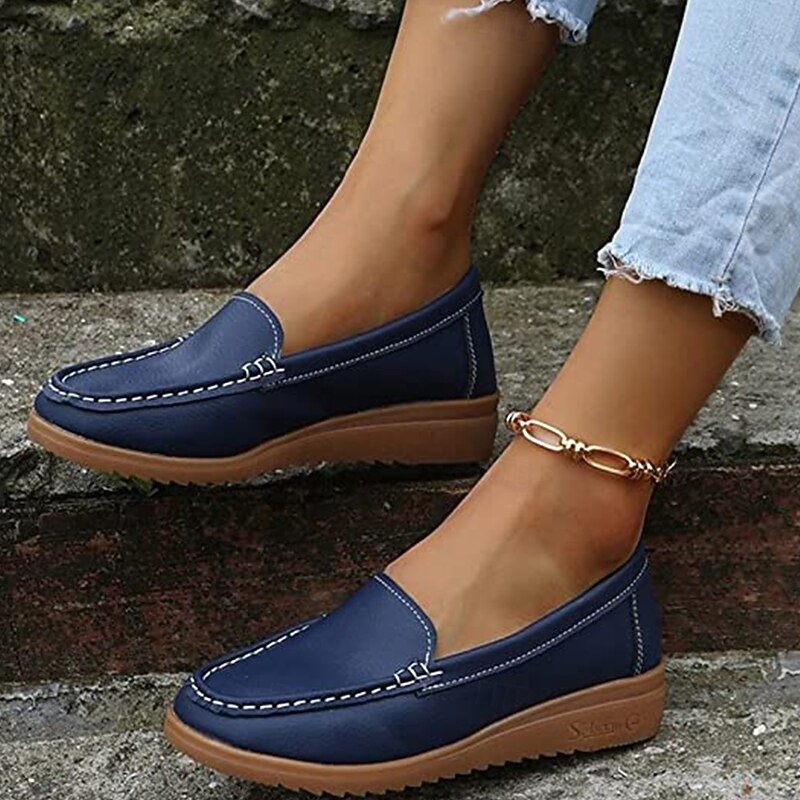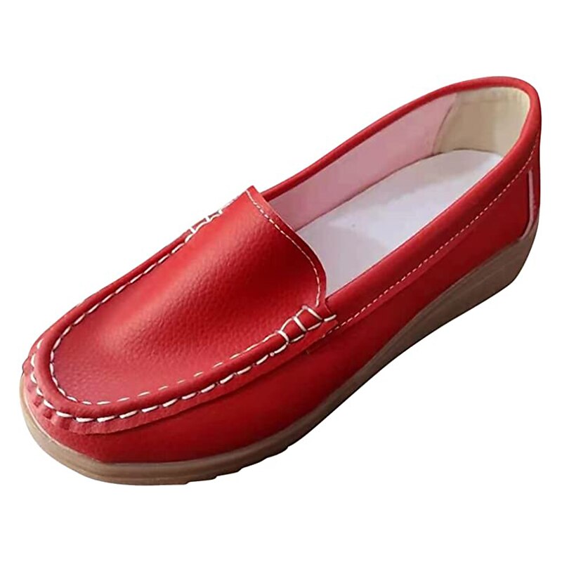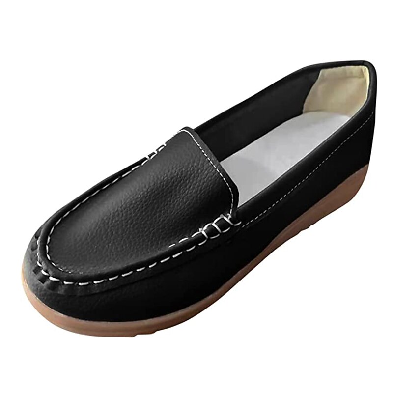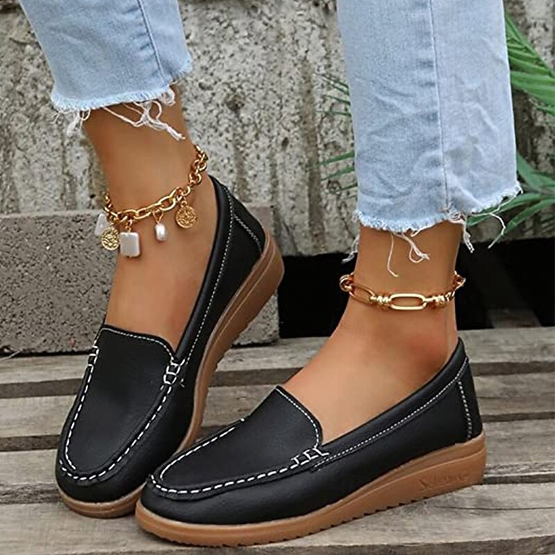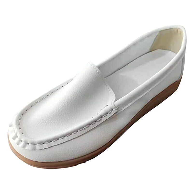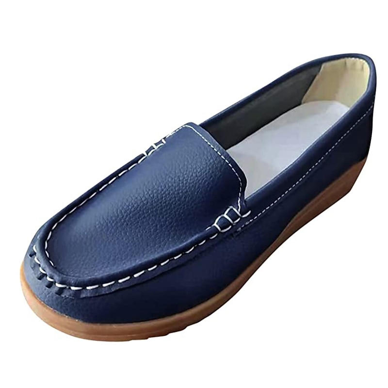Highlights [Material] : These women's loafers are crafted from high-quality PU leather, known for its durability and smooth texture. The material ensures a soft, comfortable fit, making them a staple for daily wear. [Fit] : Featuring a classic loafer style with a modern twist, these shoes boast a wedge heel that adds subtle height and elegance. The round toe design offers a spacious fit, ideal for longer wear. [Design Highlights] : The slip-on design allows for convenient wear, while the detailed stitching along the upper adds a sophisticated touch to these minimalistic loafers. The sleek silhouette with solid colors provides versatility, complementing both casual and semi-formal attire. [Occasions] : Perfect for daily activities, work environments, outdoor ventures, and office settings. These loafers are designed to provide comfort and style, making them suitable for a variety of occasions. Their vibrant color selection can effortlessly enhance any outfit. [Size Range] : Available in a range of sizes from US6 (EU36, UK4) to US10.5 (EU42, UK8.5), these loafers cater to a diverse audience, ensuring a comfortable fit for different foot sizes.