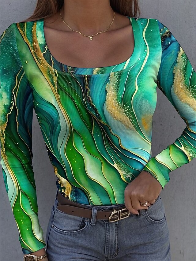 Women's T shirt Long Sleeve Ribbed Graphic Square Neck Long Sleeve Casual Ombre Abstract Regular Tops Daily Print Red Blue Green Rainbow Light Blue Spring Fall Prefall 9