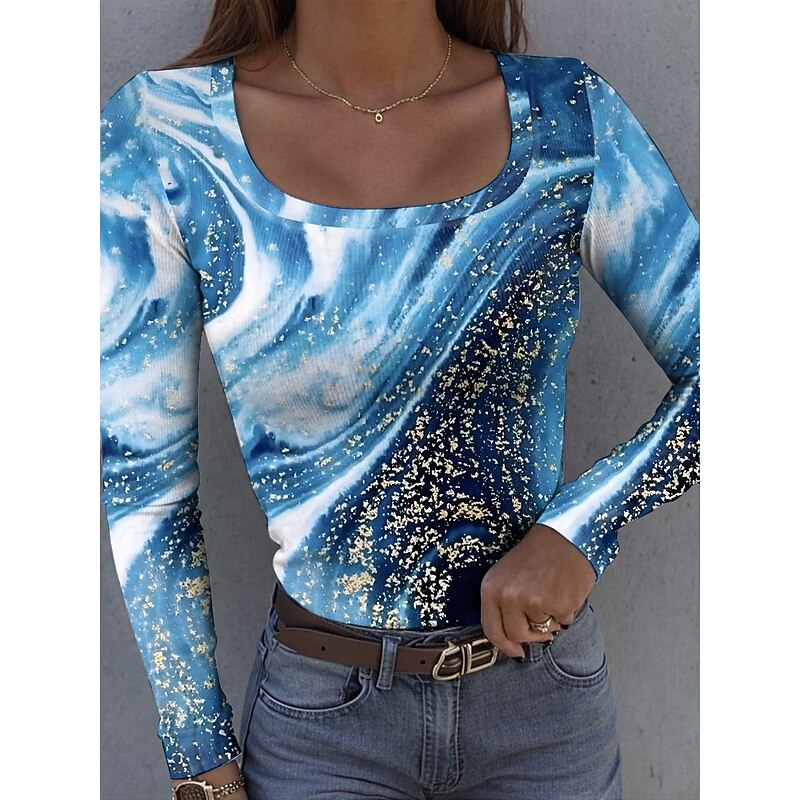 More information about Women's T shirt Long Sleeve Ribbed Graphic Square Neck Long Sleeve Casual Ombre Abstract Regular Tops Daily Print Red Blue Green Rainbow Light Blue Spring Fall Prefall