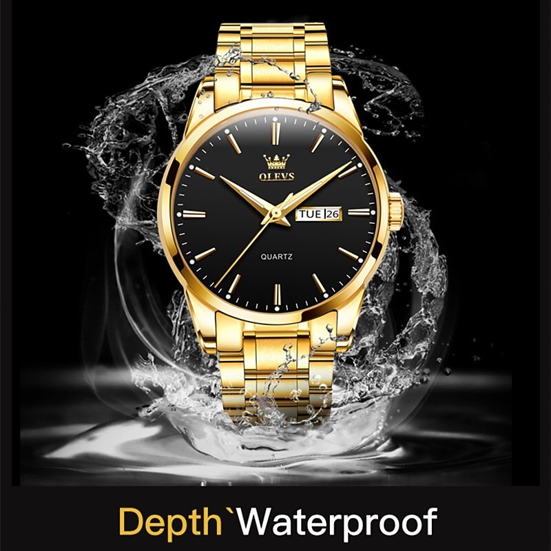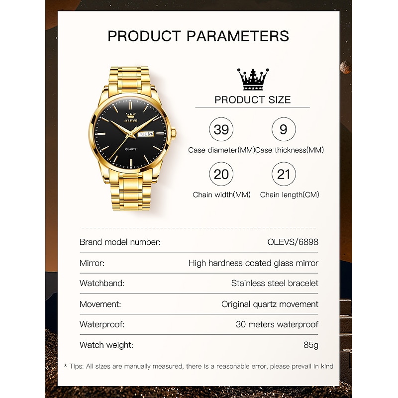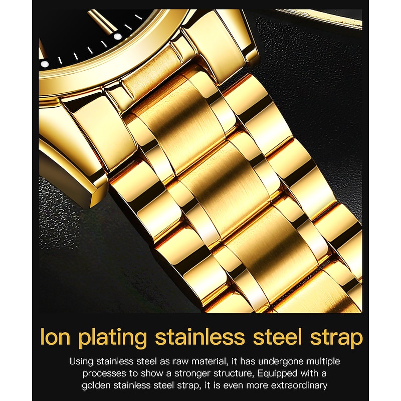 Highlights - Elegant and fashionable watch for mature men - Plated gold strap with golden luster and luminous black dial - Suitable for various occasions, including business and parties - Gives a valuable impression and suggests an easy-to-get-along-with personality - Made with highly durable materials, including polished stainless steel and scratch-resistant hardness glass - Features a steel and luminous dial with water resistance - Equipped with Japanese quartz movements and imported battery for stability and accuracy for years to come - Adjustable mesh stainless steel strap that can be disassembled and comes with a free adjust steel belt tool for wrist sizing.