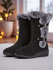 More information about Women's Black Faux Suede Mid-Calf Winter Boots – Plush Fur Lined, Non-Slip Outdoor Wedge Heel Snow Boots, Warm Trekking & Travel Footwear
