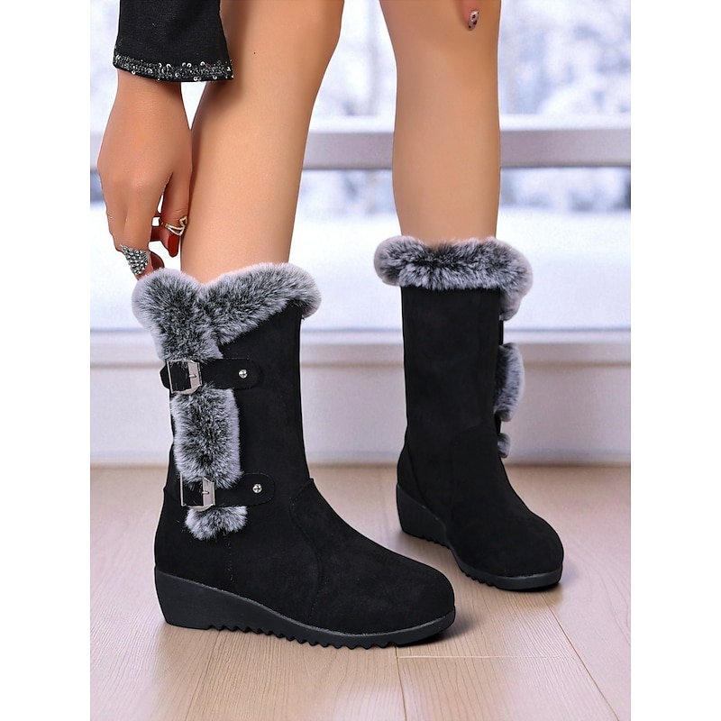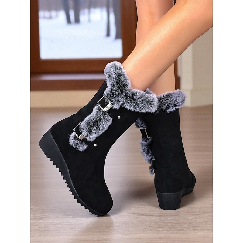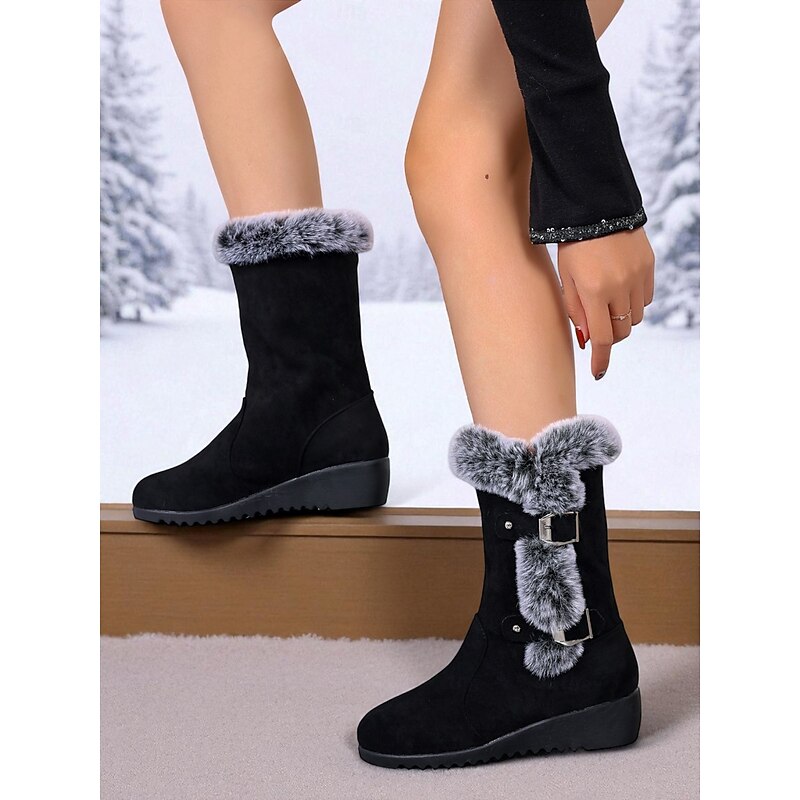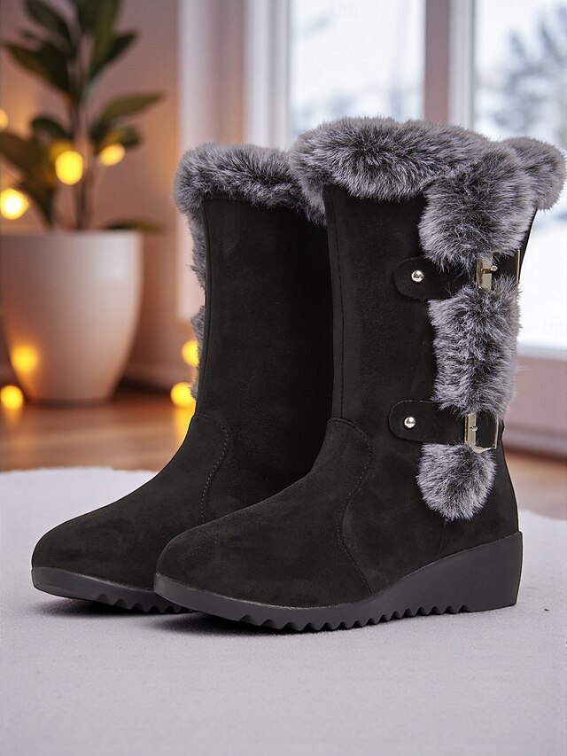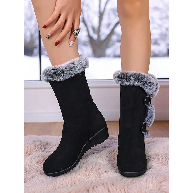HOT ! Women's Black Faux Suede Mid-Calf Winter Boots – Plush Fur Lined, Non-Slip Outdoor Wedge Heel Snow Boots, Warm Trekking & Travel Footwear