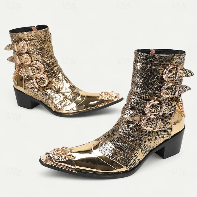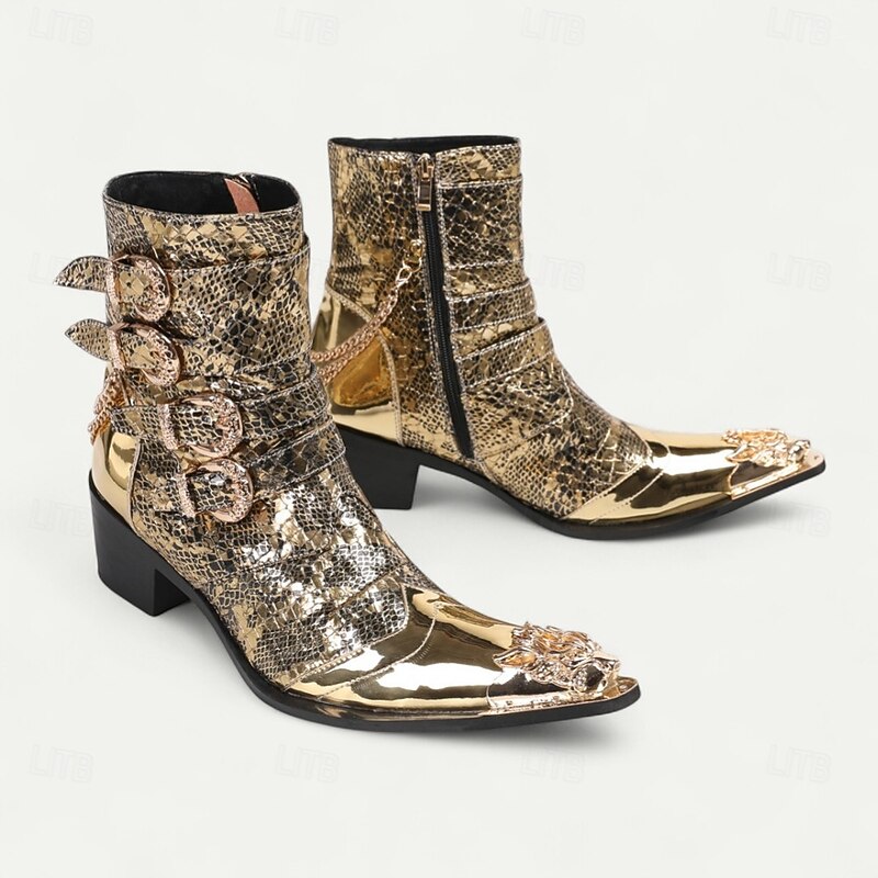 HOT ! Men's Gold Crocodile-Pattern Ankle Boots – Rocker Style Western Boots with Buckles for Parties, Concerts and Nightlife Fashion
